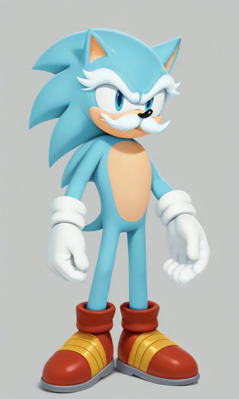 Sir Charles the Hedgehog, blue fur, big bushy light blue eyebrows, light blue moustache, blue eyes, white gloves, faded red shoes