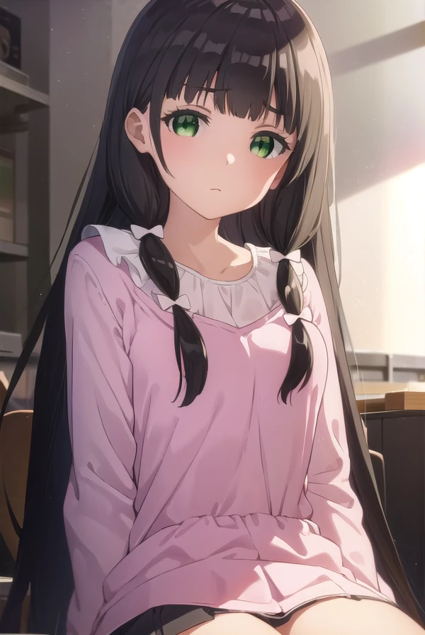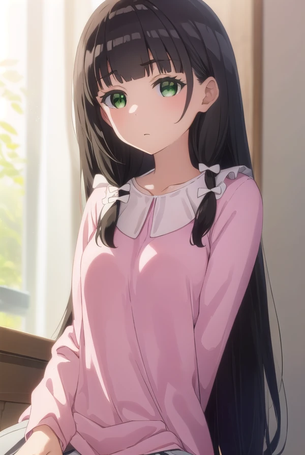 kaiko mikuniyama, long hair, bangs, black hair, bow, (green eyes:1.3), hair bow, blunt bangs, white bow, pink bow,
