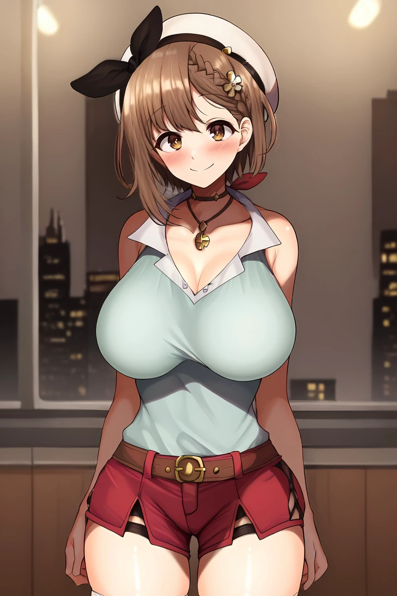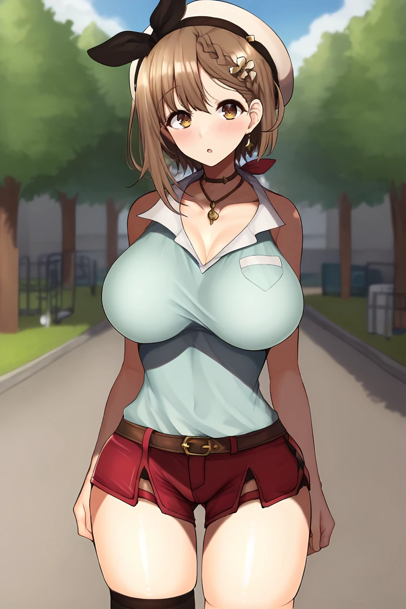outfit 2: collarbone, necklace, cyan shirt, sleeveless shirt, collared shirt, brown belt, red shorts, short shorts, single thighhigh, brown choker, red ribbon, neck ribbon