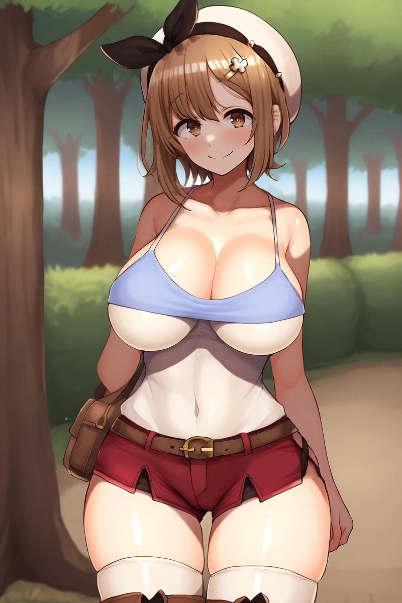 outfit 1: white camisole, white shirt, two-tone camisole, blue trim camisole, collarbone, brown belt, red shorts, short shorts, brown boots, thigh boots, white thighhigh