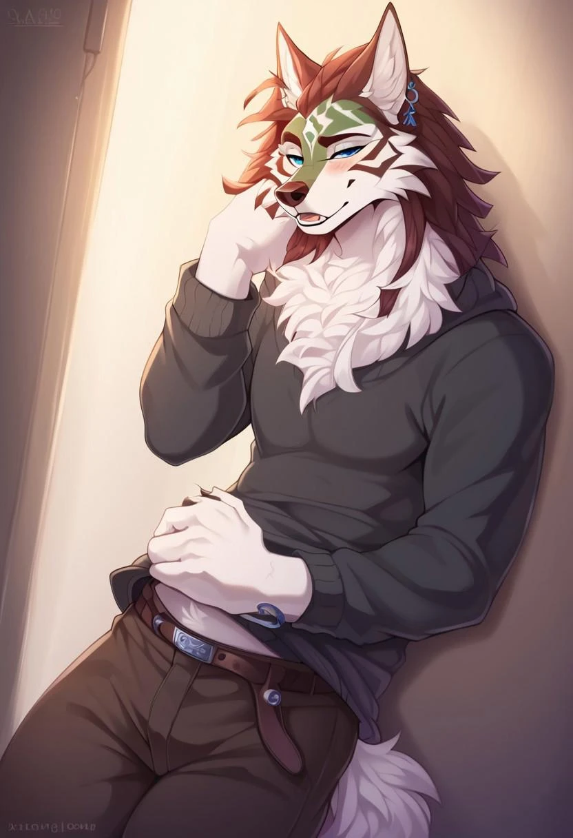 wolflink, wolf anthro, earrings,white facial markings,blue eyes,wolf tail,fluffy chest fur