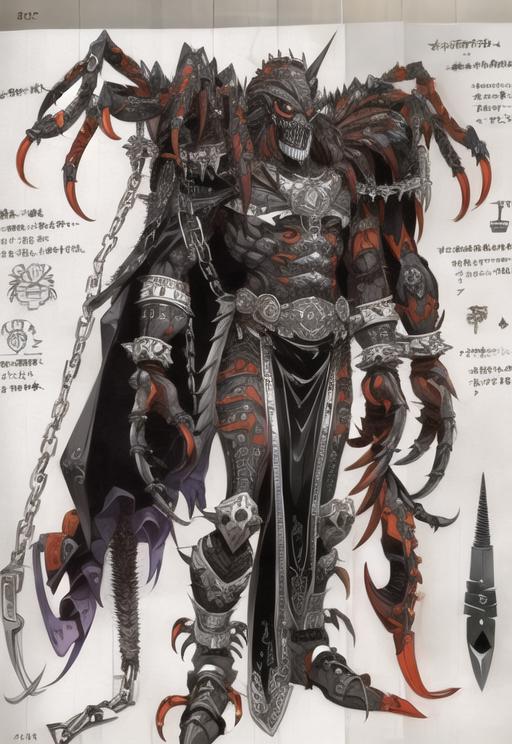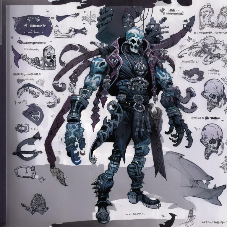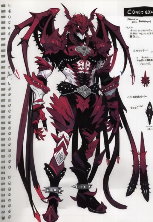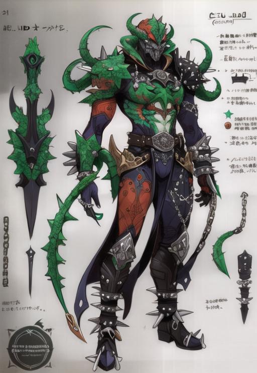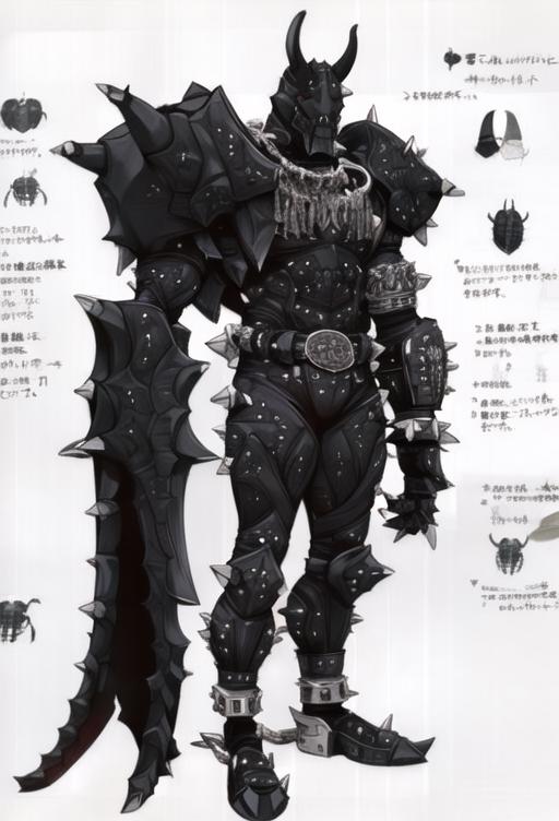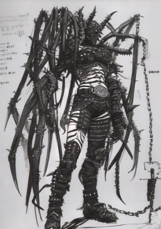 Try to start and end with : (((concept art, drawing, sketch, Undd, solo))) (put here type, color), (((spikes))), belt, (((leather))), (((ring chains))) (((asymmetrical))), <lora:Undead Nirasawa II:0.*>