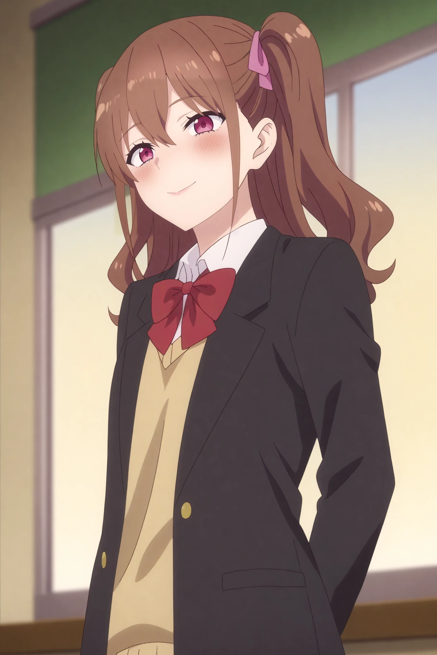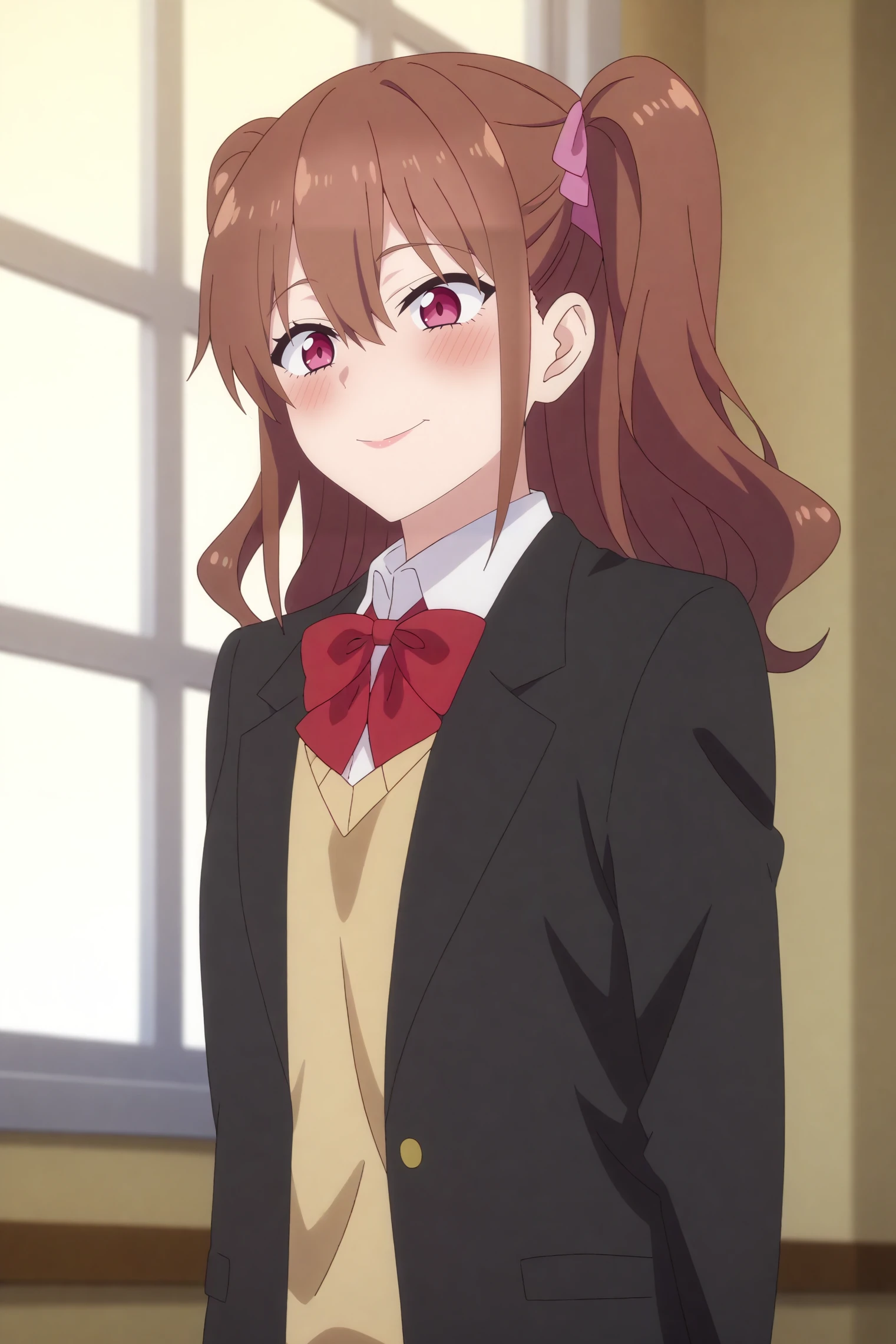 mikari tachibana,1girl,solo,school uniform,jacket,ribbon,long hair,blush,twintails,bow