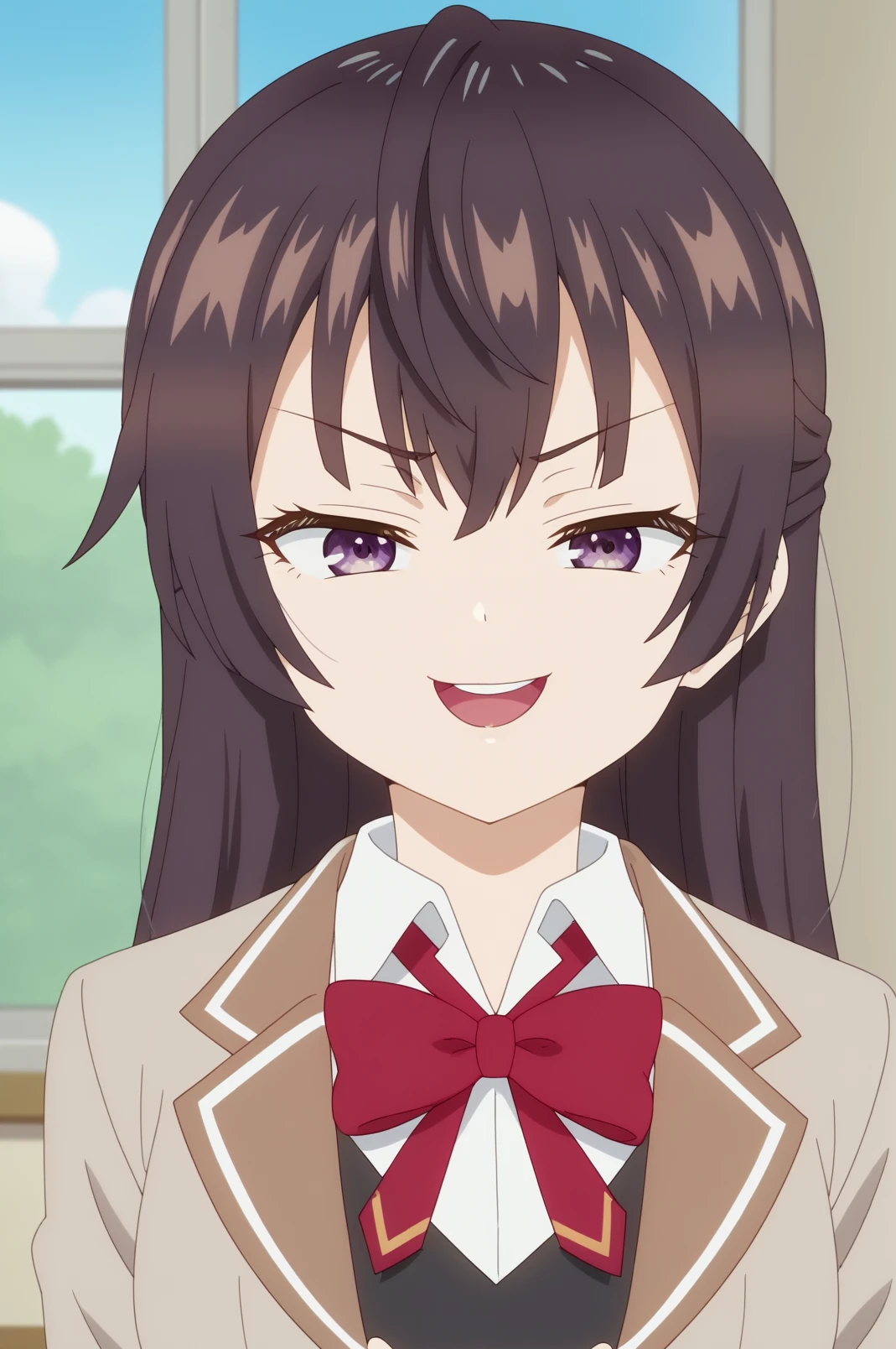 Yuki suou,anime screencap,1girl,solo,mature,long hair,school uniform,bow,purple eyes,jacket,bangs,red bow,shirt,collared shirt