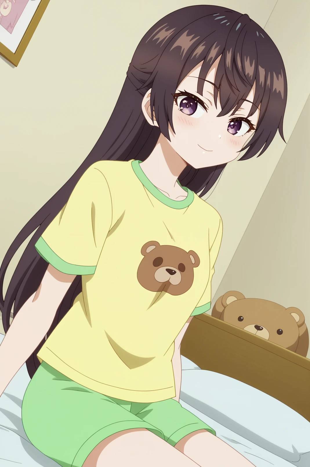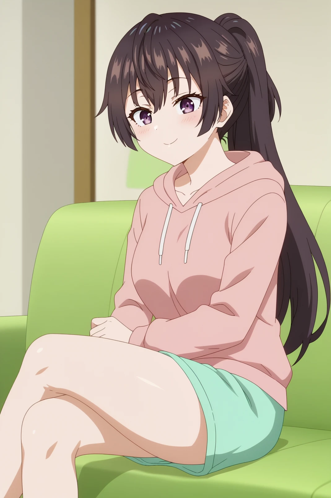 Chilling : ponytail,indoors,green sofa,pink hoodie, white short