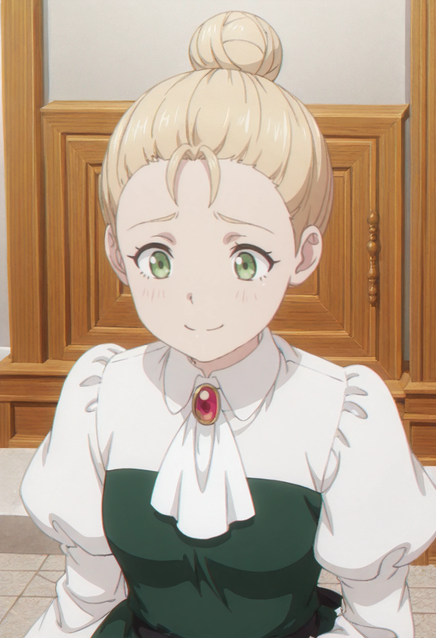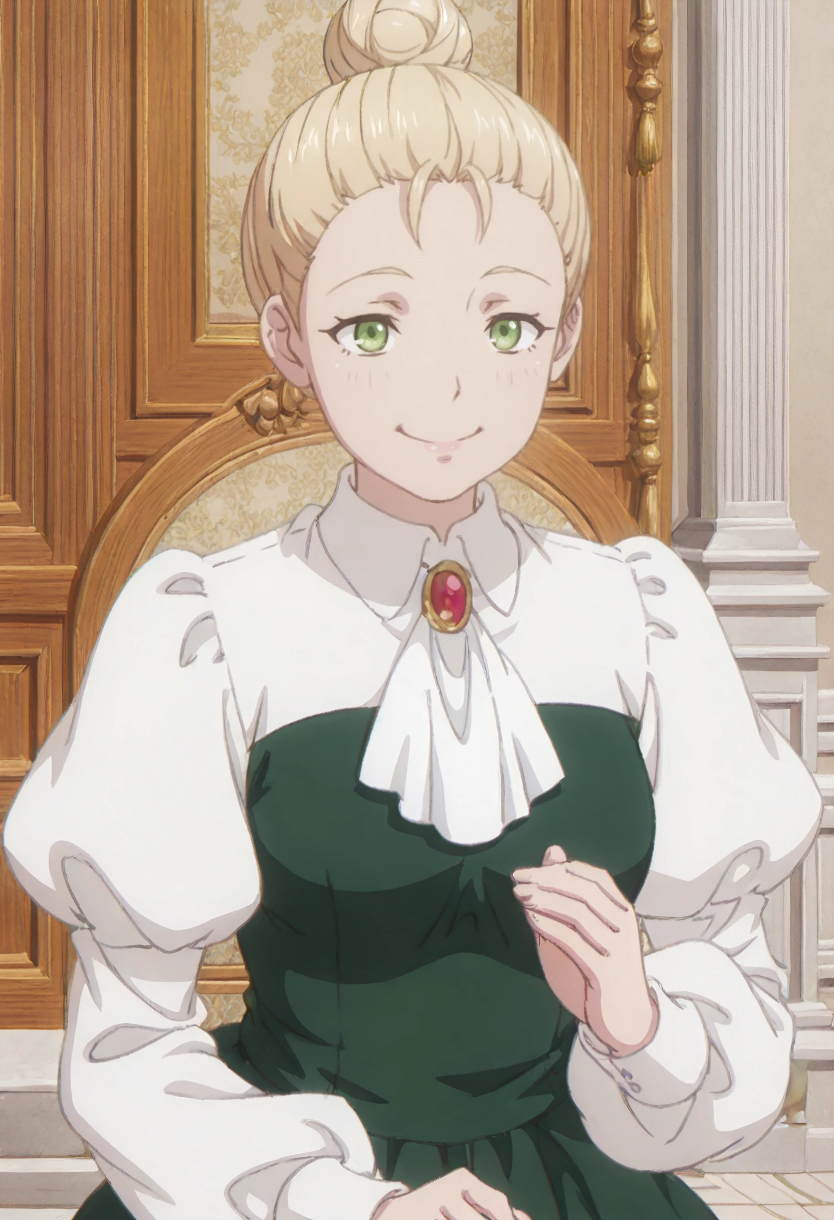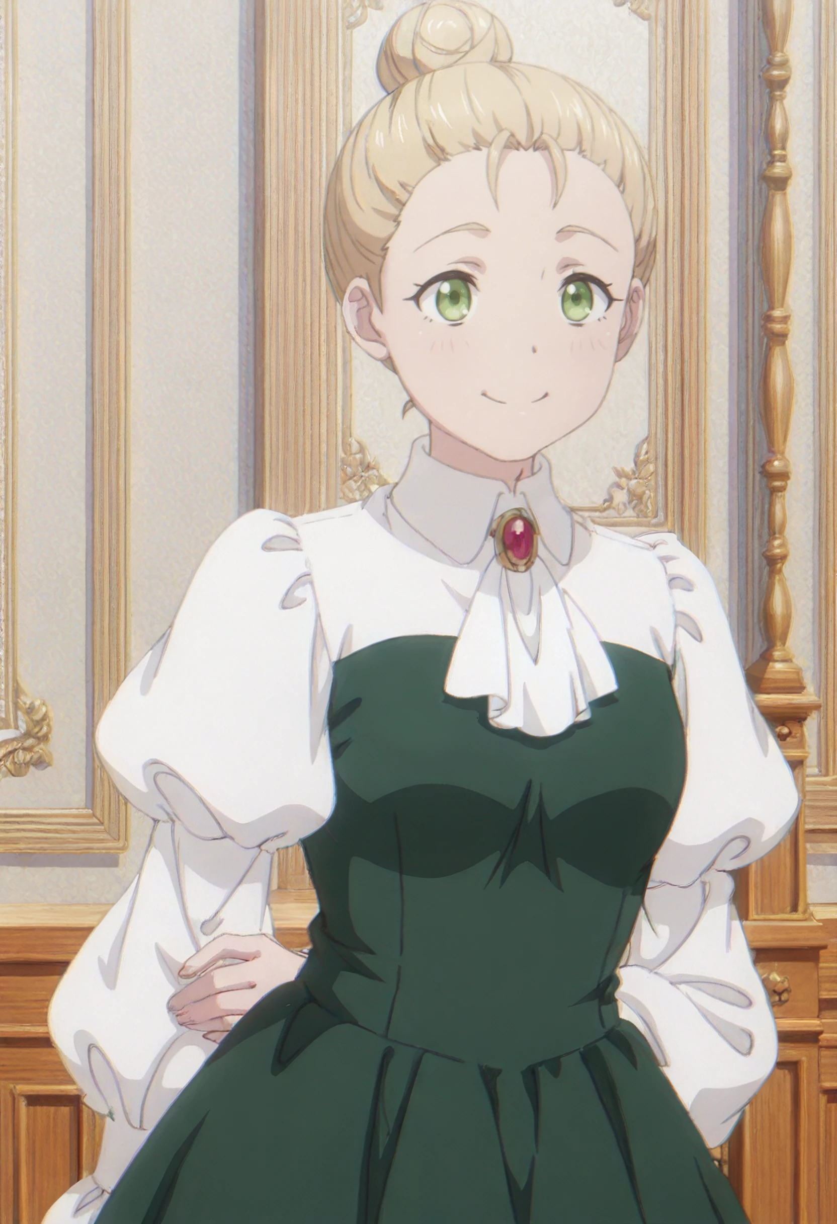 LindsayOutfit, ascot, white ascot, long sleeves, brooch, puffy sleeves, jewelry, green dress, white shirt, juliet sleeves, gem, aristocratic clothes, red gemstone, collared shirt, red brooch,