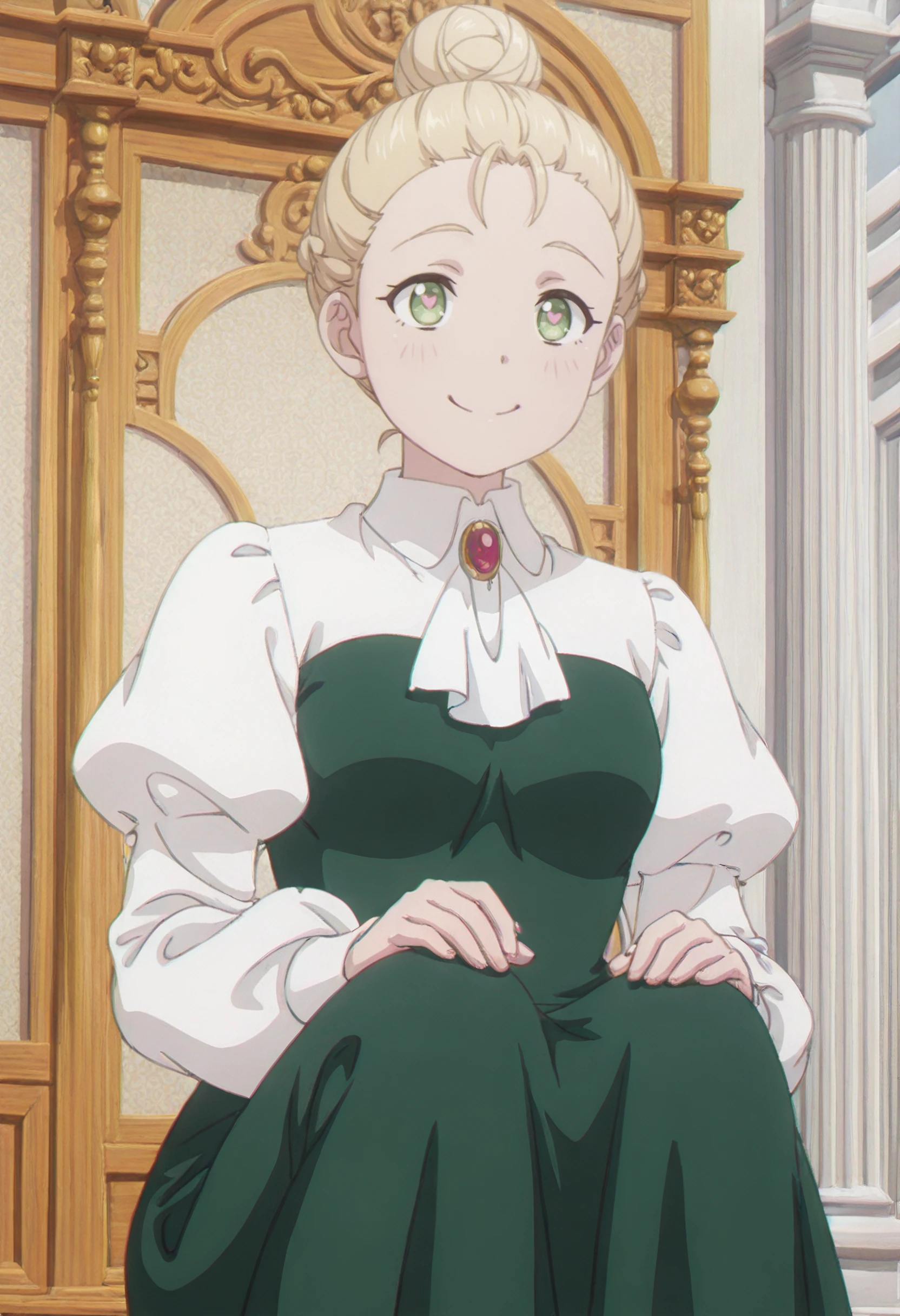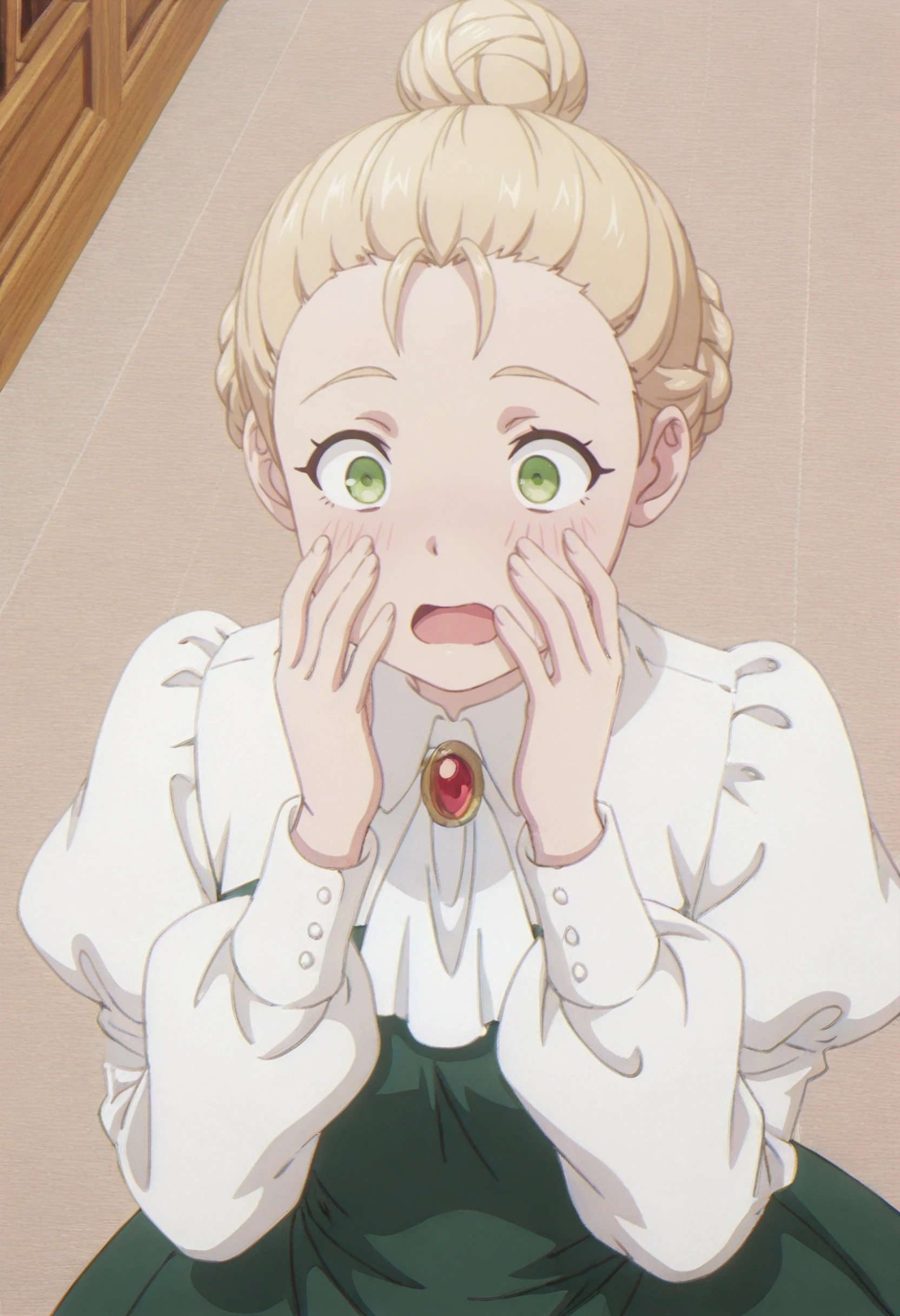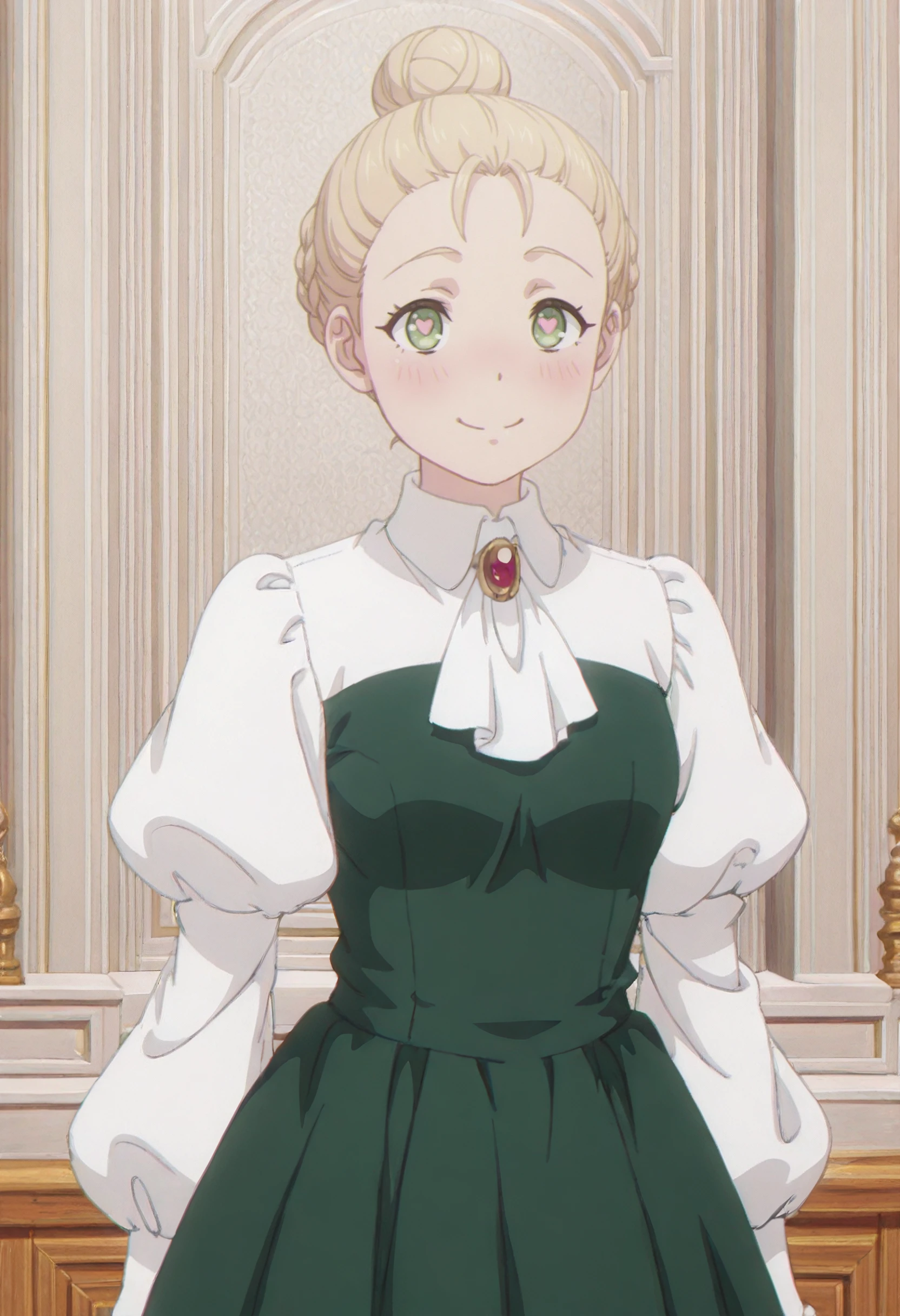 LindsayOutfit, ascot, white ascot, long sleeves, brooch, puffy sleeves, jewelry, green dress, white shirt, juliet sleeves, gem, aristocratic clothes, red gemstone, collared shirt, red brooch,