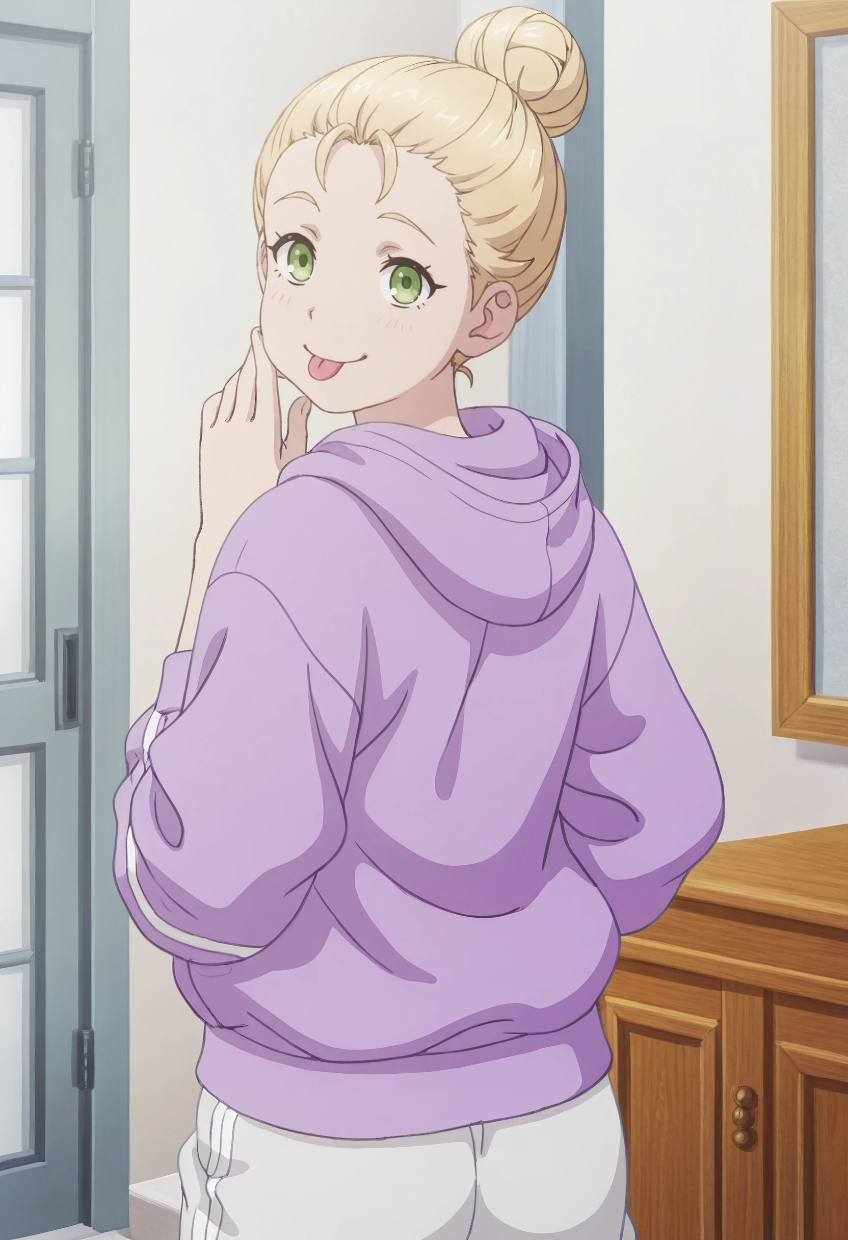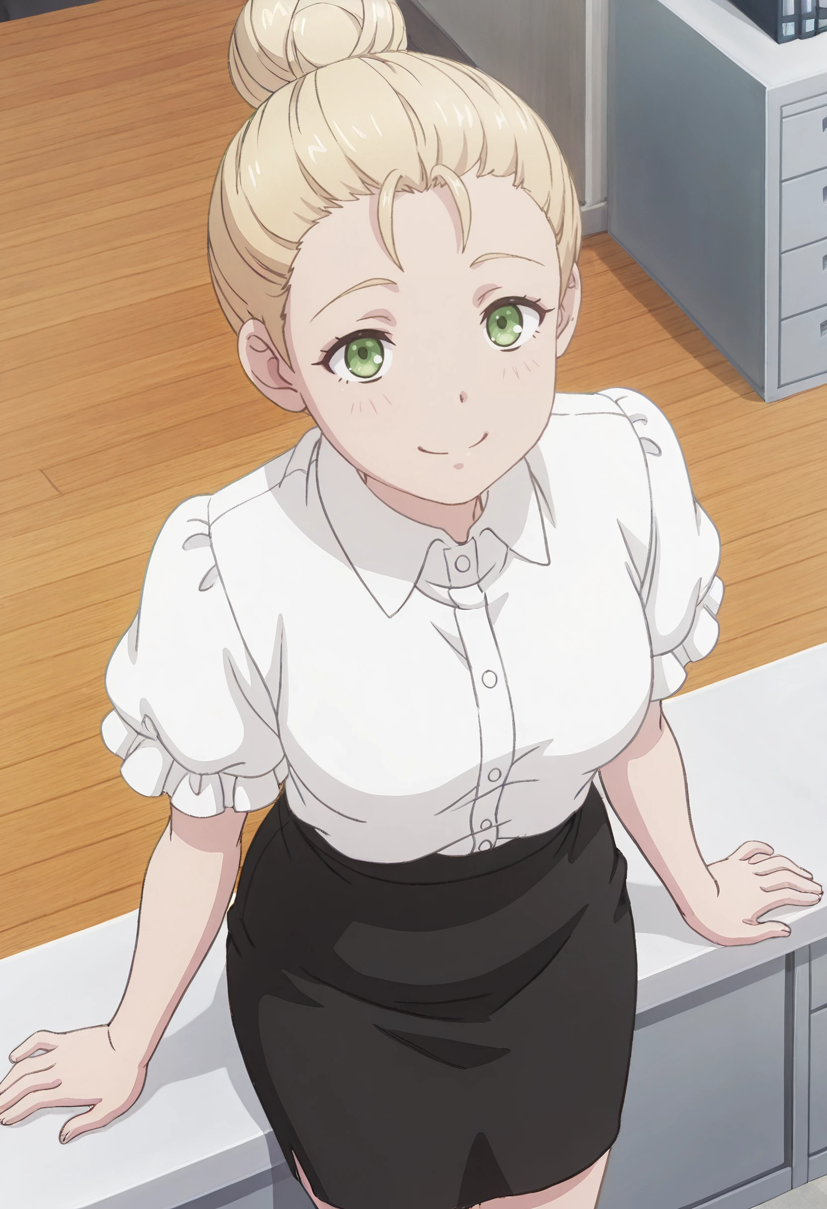 SWCLindsay, single hair bun, blonde hair, short hair, hair bun, green eyes, hair up, hair pulled back, braid, updo,