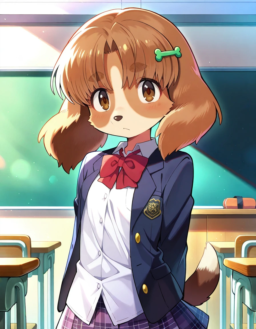 school uniform, white socks, blue jacket, white shirt, red bowtie, brown footwear, miniskirt, collared shirt, long sleeves,