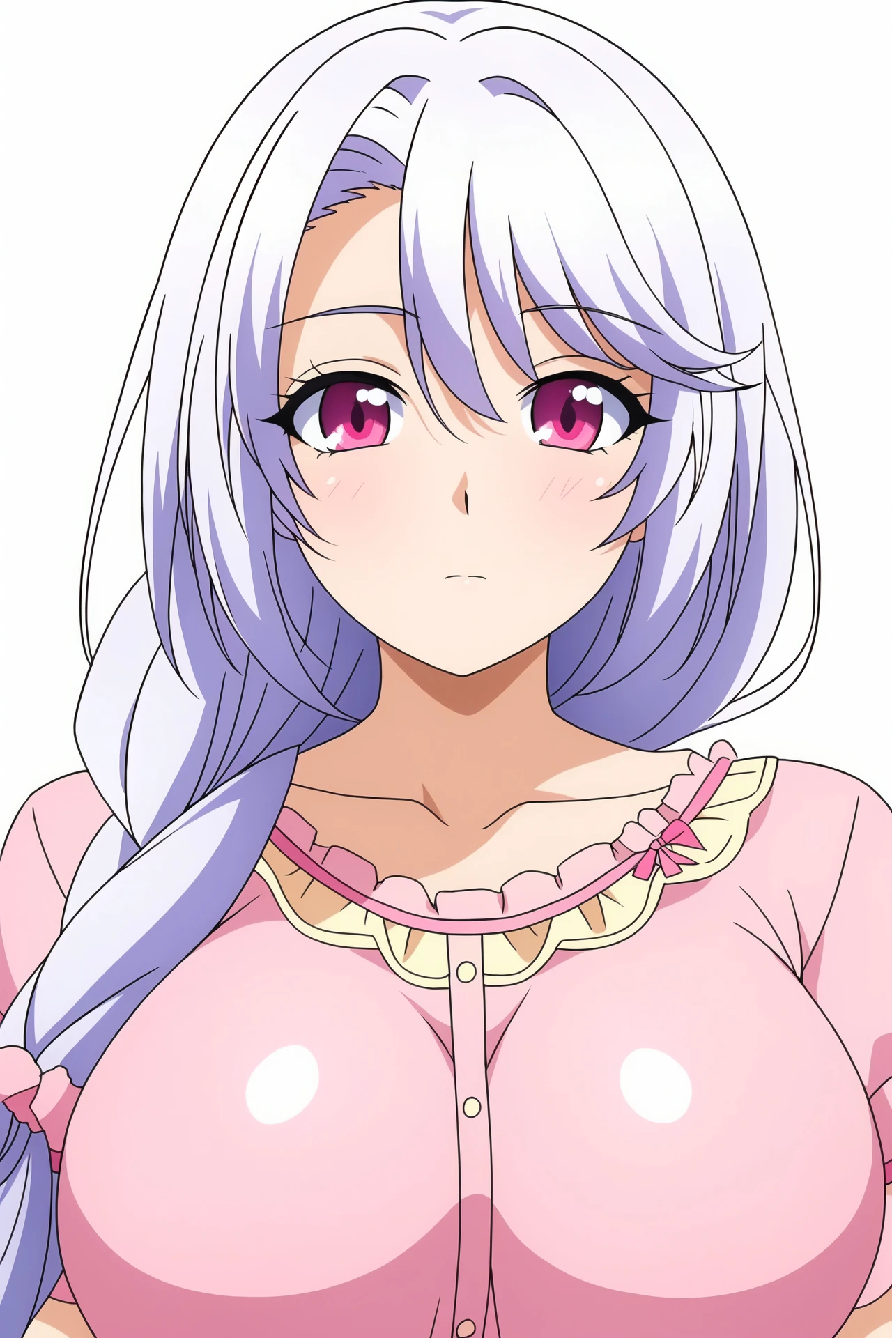 long hair,pink eyes,silver hair,single braid, hair ornament,