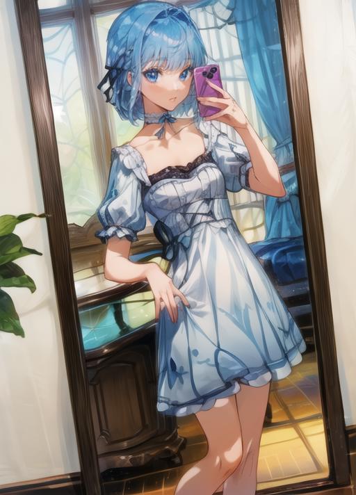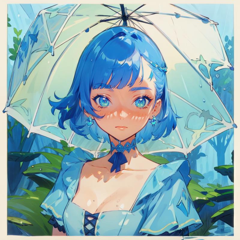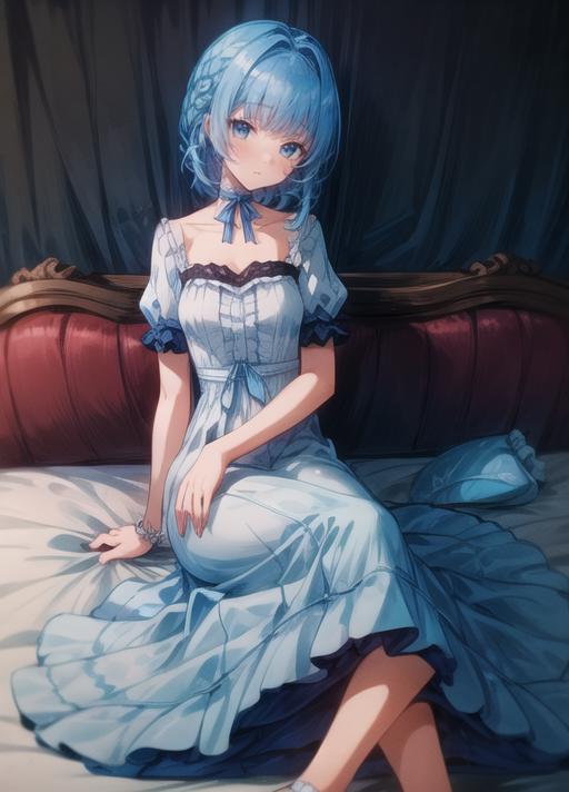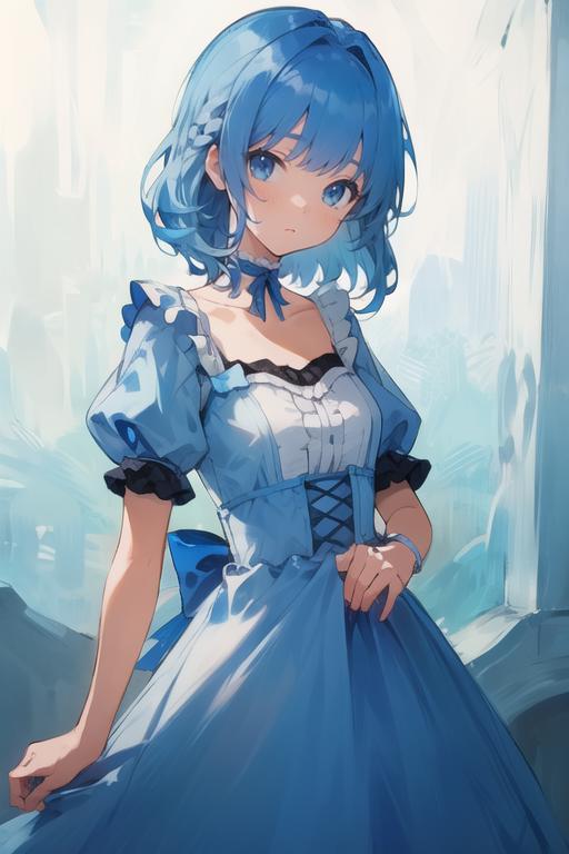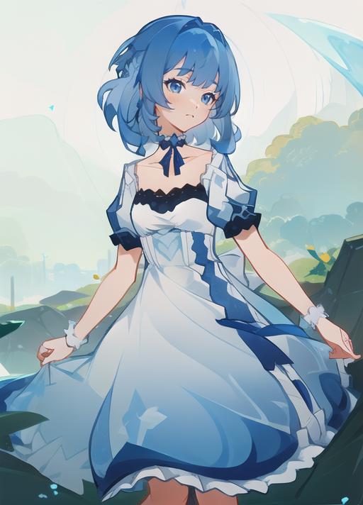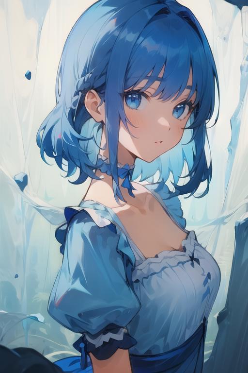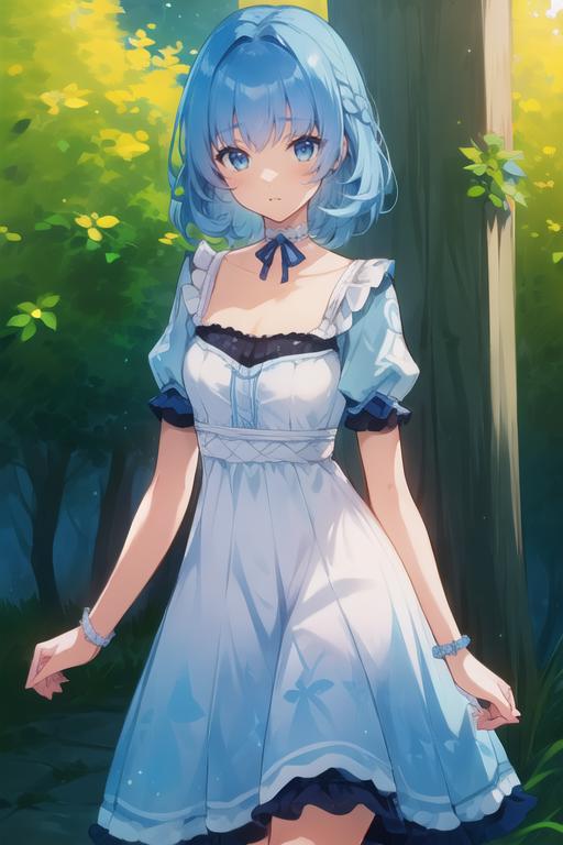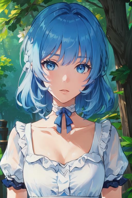 masterpiece, best quality),(depth) of (field), <lora:Mary-Ann:0.8> 1girl, white and blue dress, blue hair, medium length hair, frills, bangs, choker, blue eyes, <lora:st-fs_v1.1:-1>, portrait, adult