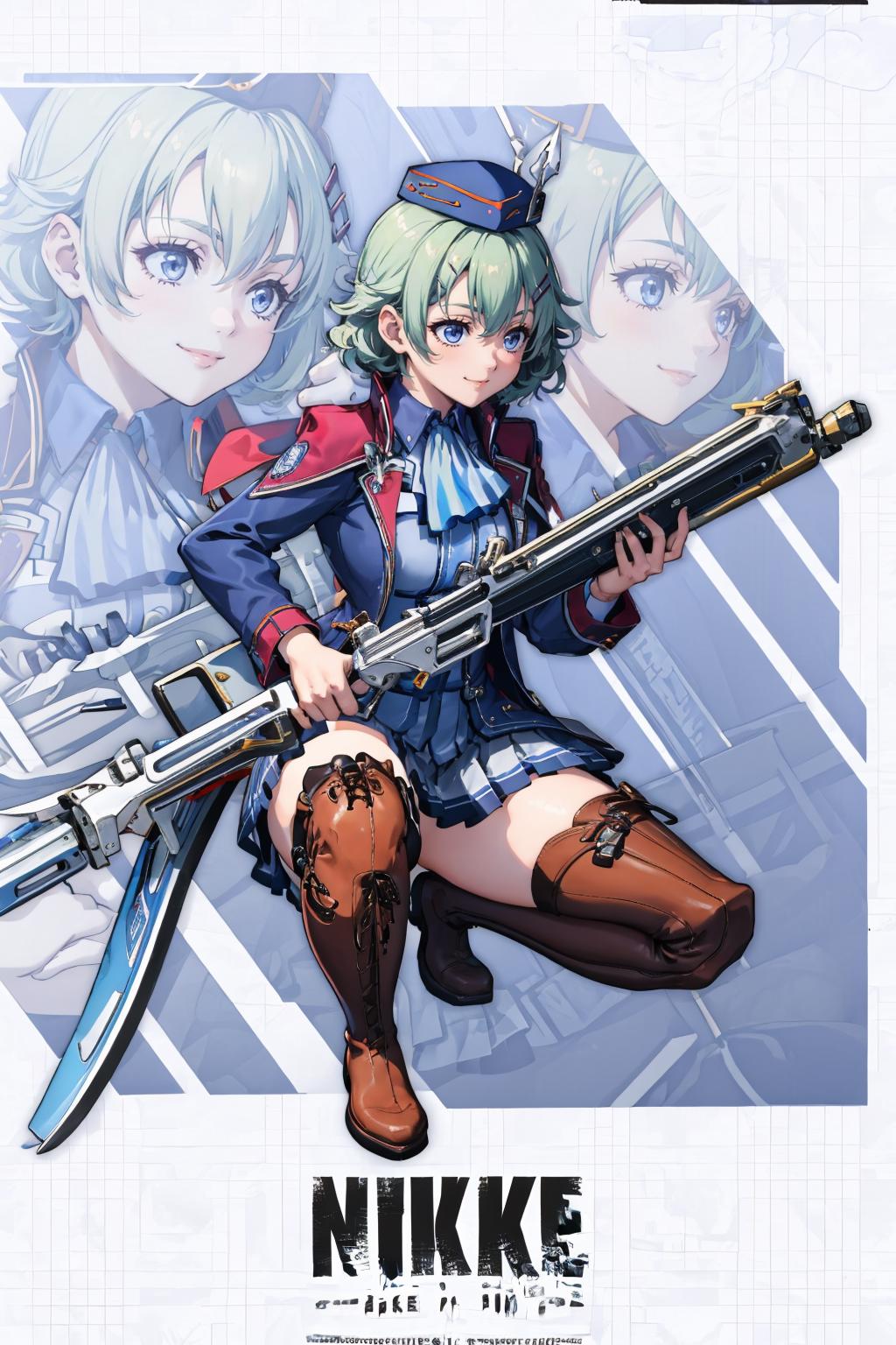 blue hat, hairclip, ascot, blue jacket, blue shirt, white miniskirt, thigh boots