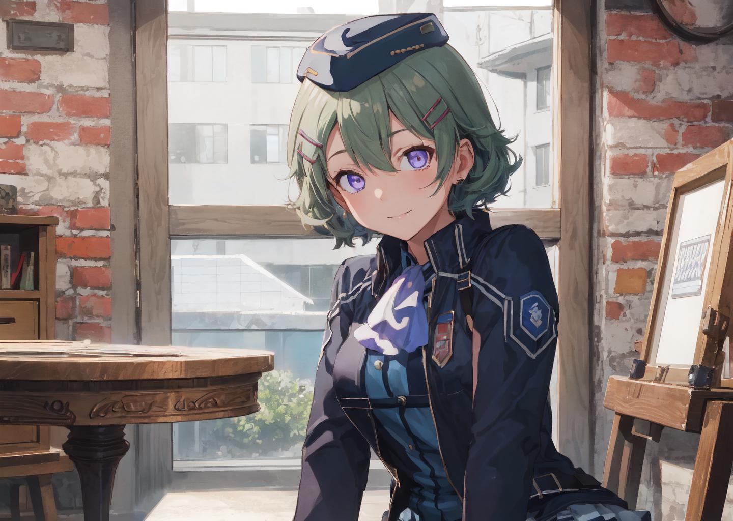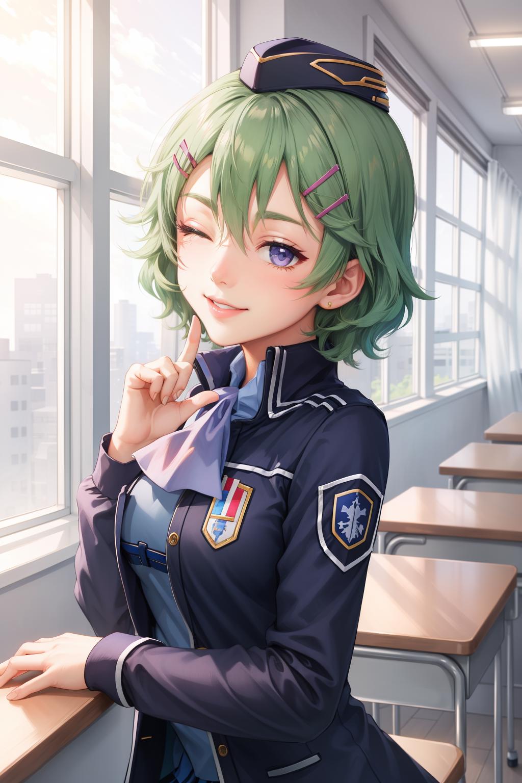Add "blue hat, hairclip, ascot, blue jacket, blue shirt, white miniskirt, thigh boots" for her Sen III student outfit.