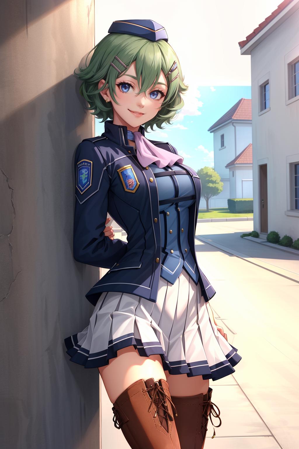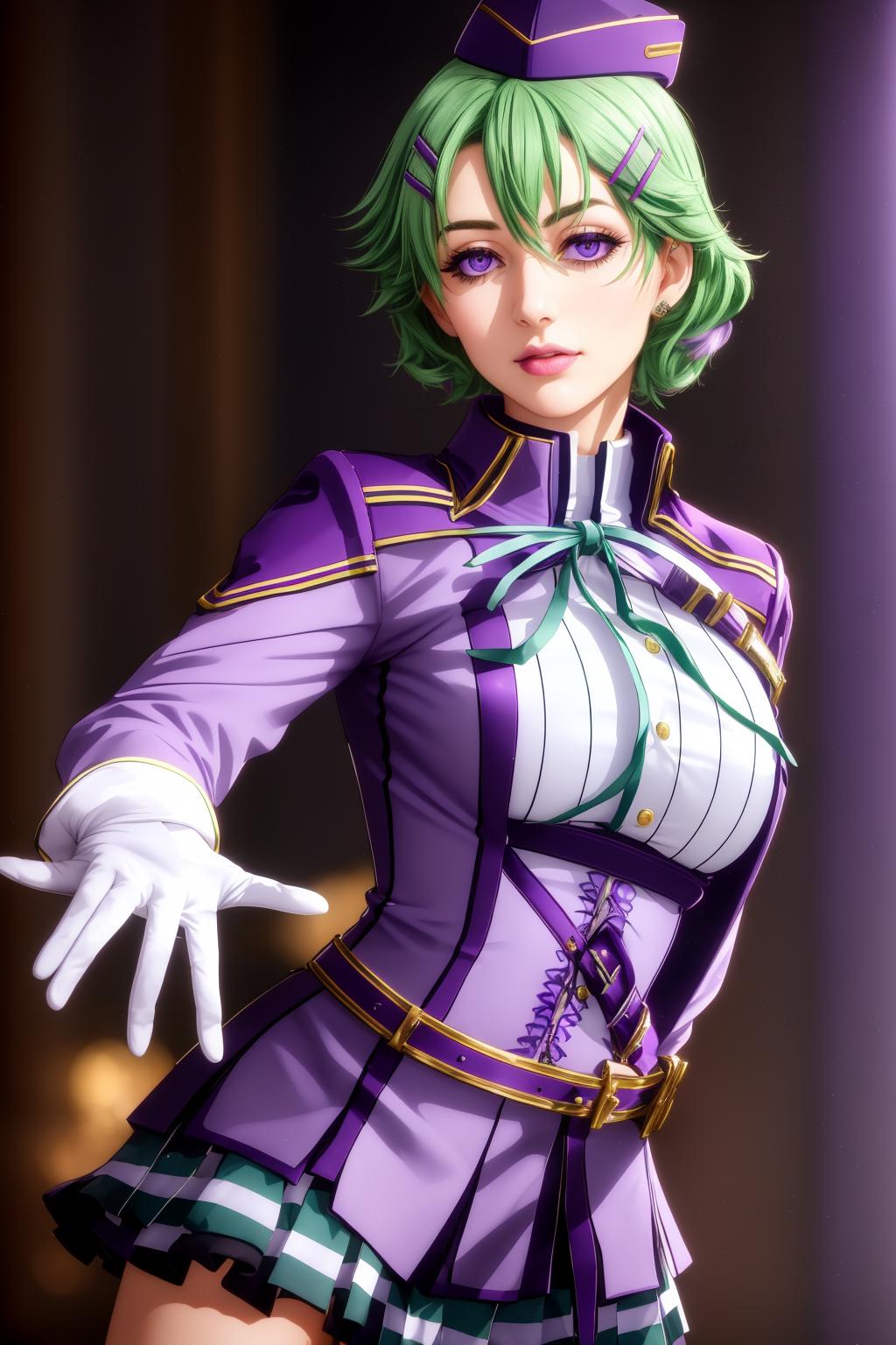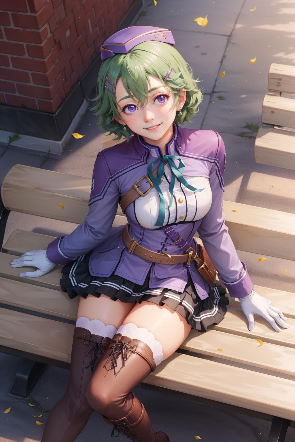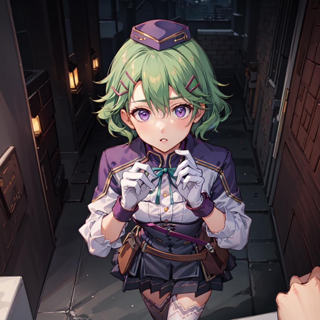 Add "purple hat, hairclip, green ribbon, purple jacket, white gloves, belt, purple miniskirt, white thighhighs, black boots" for her Sen IV look.