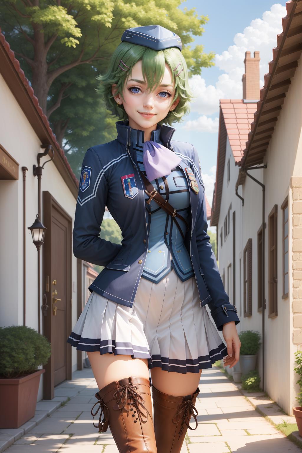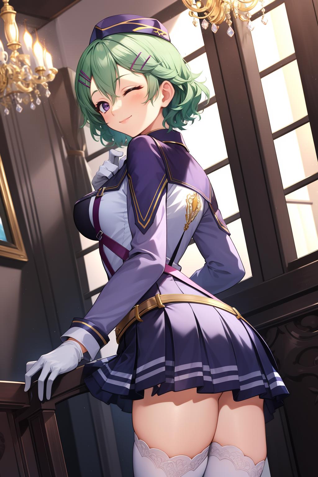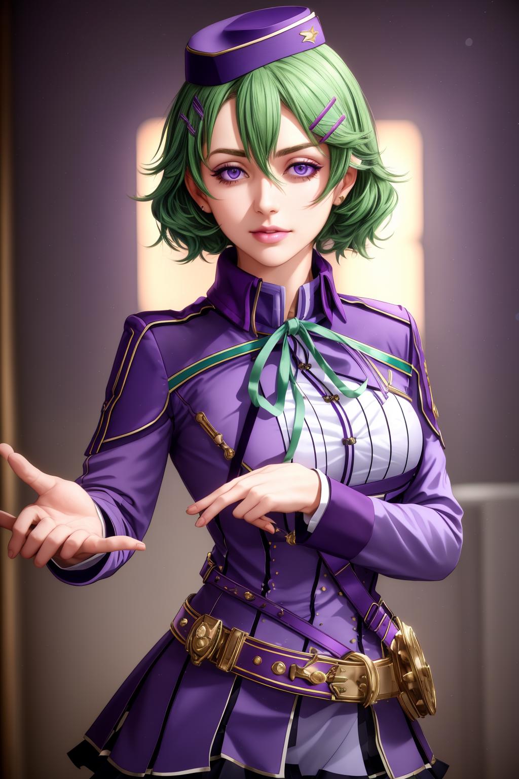 Add "purple hat, hairclip, green ribbon, purple jacket, white gloves, belt, purple miniskirt, white thighhighs, black boots" for her Sen IV look.