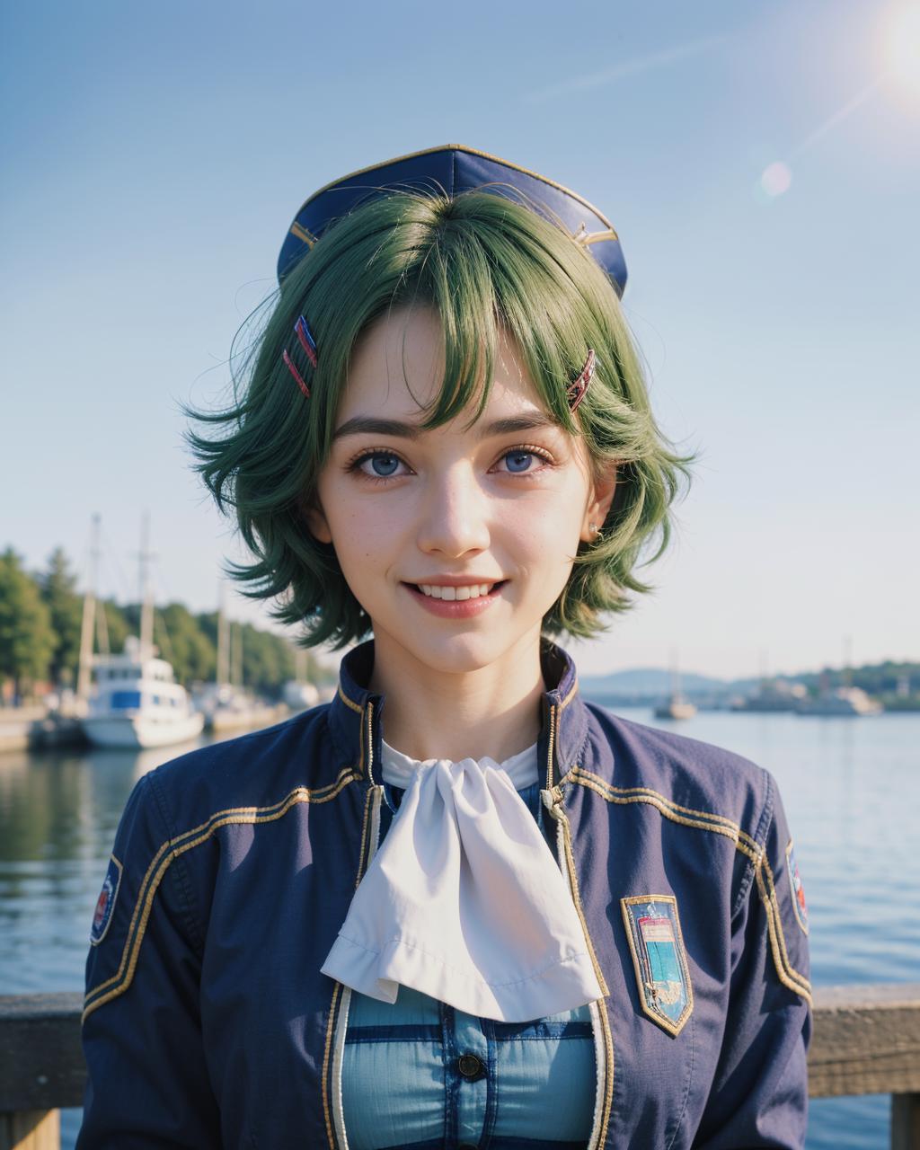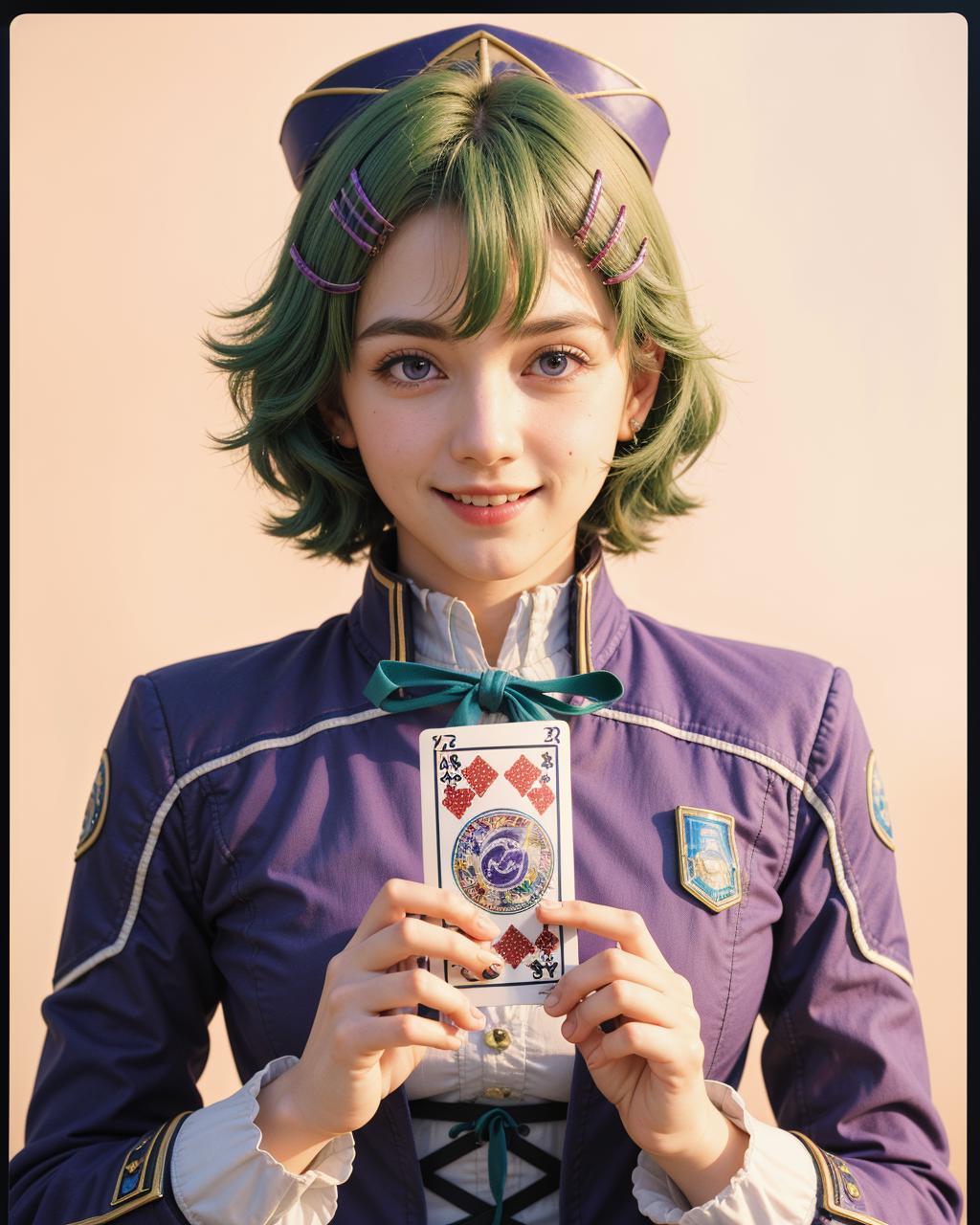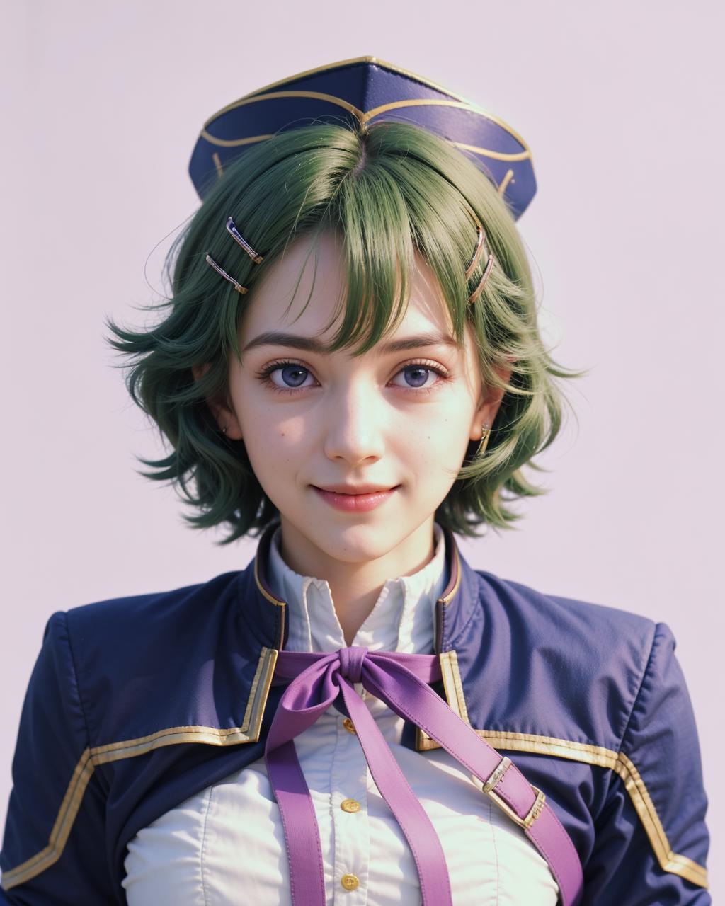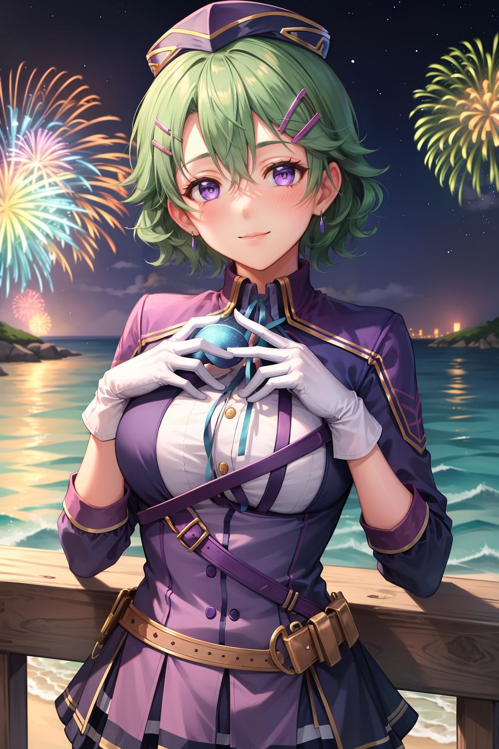 Add "purple hat, hairclip, green ribbon, purple jacket, white gloves, belt, purple miniskirt, white thighhighs, black boots" for her Sen IV look.