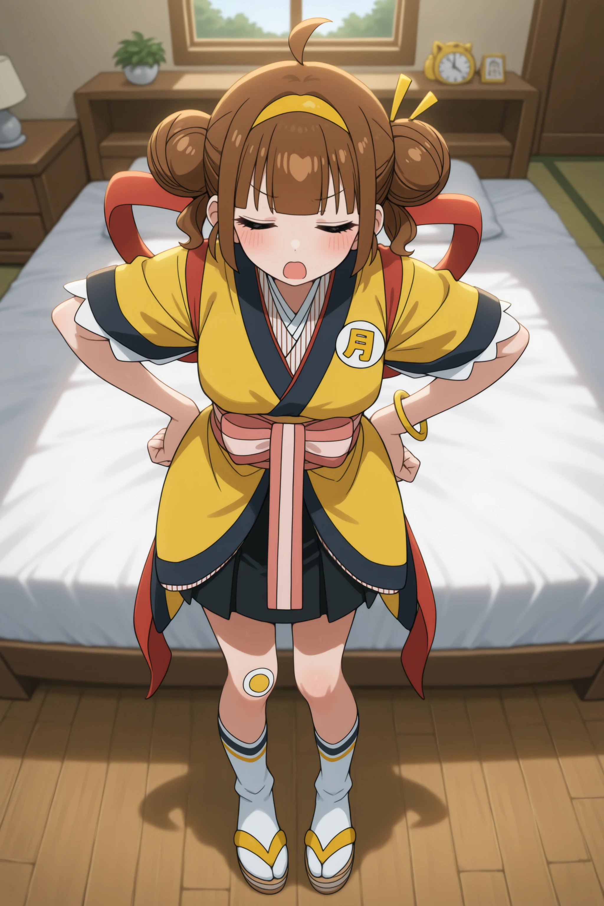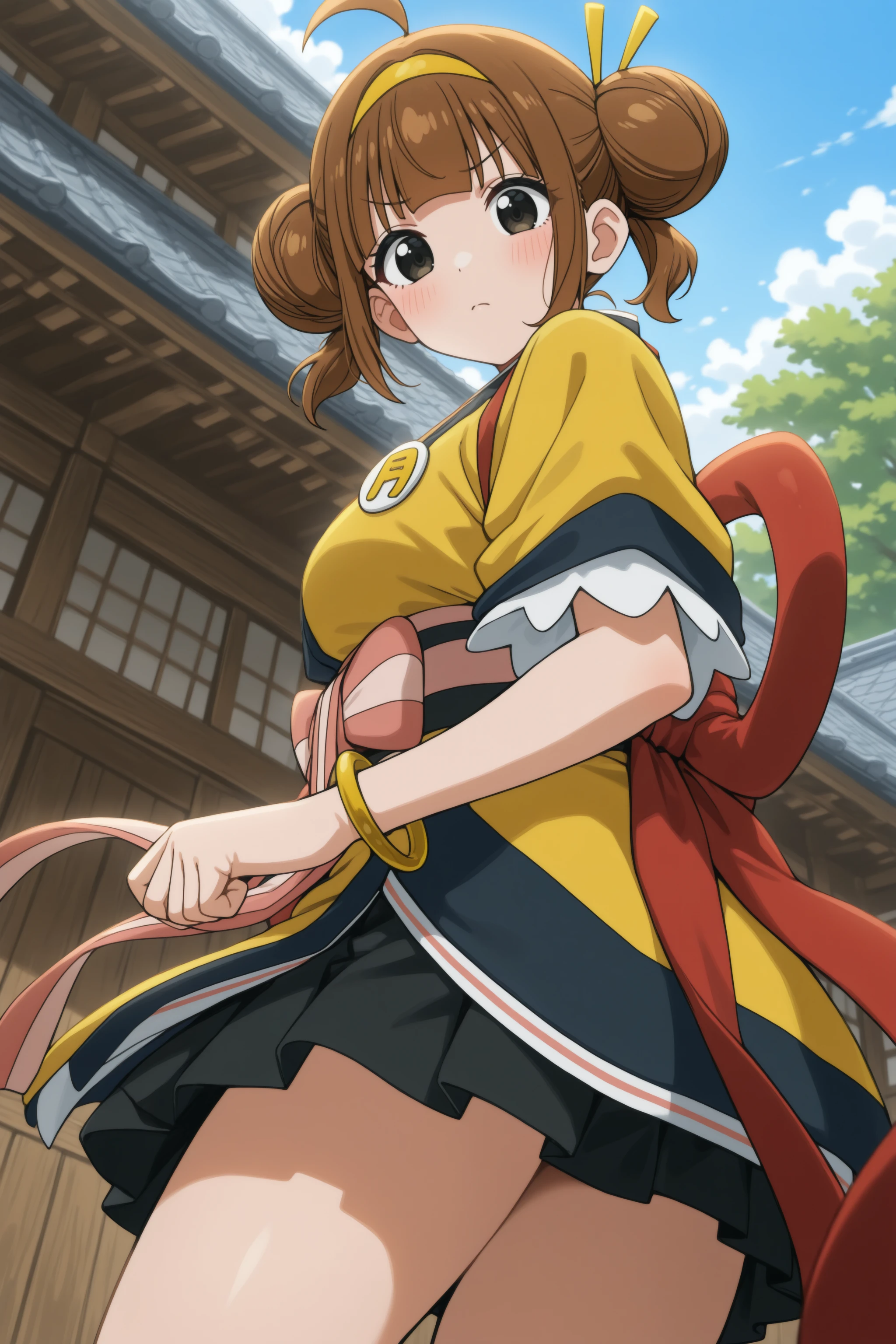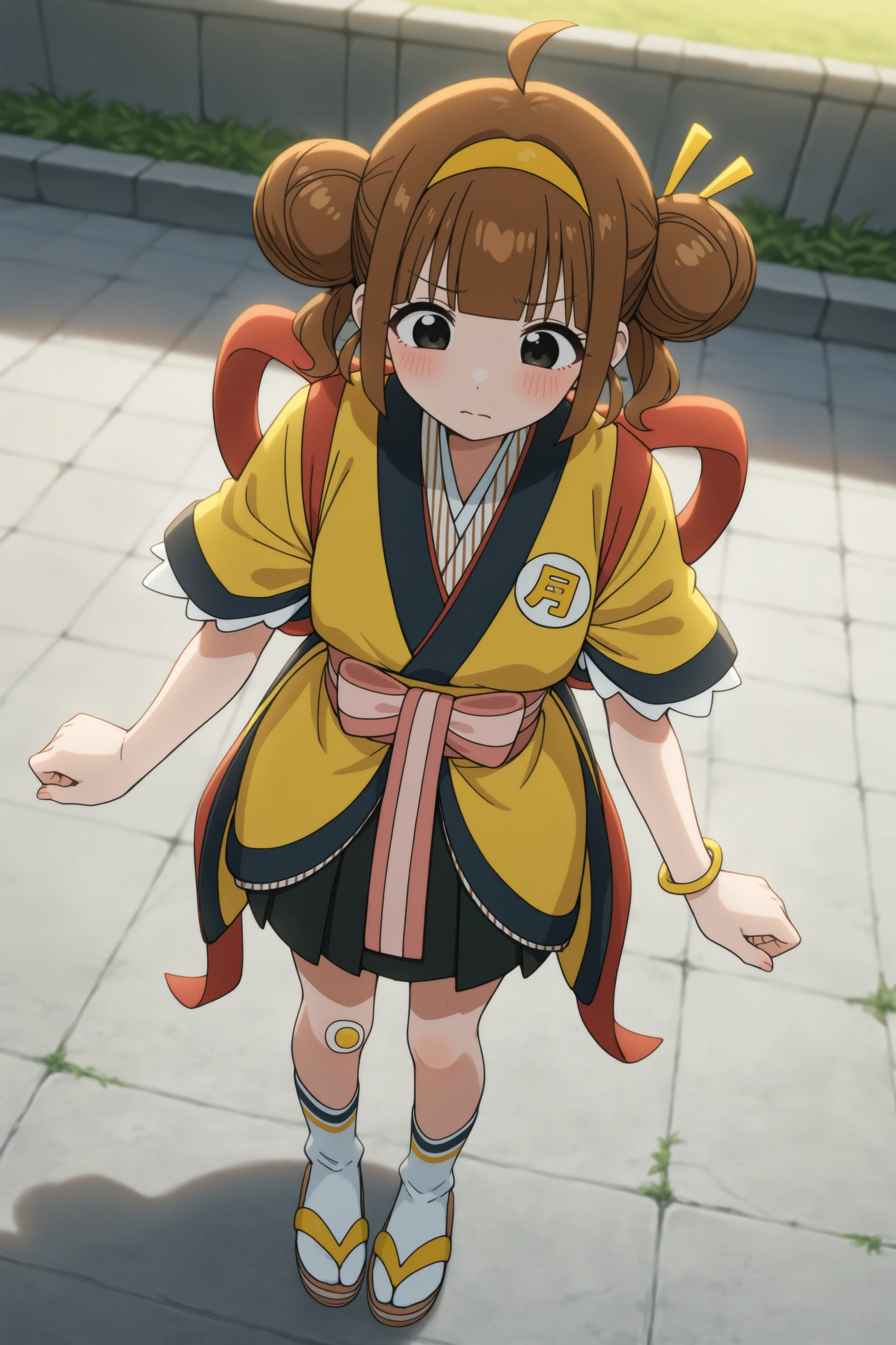 下半身 : sandals,white socks,tabi,zouri,bandaid on knee,pleated skirt 辺りから必要な物を入れて下さい。全部入れるとアホ毛から靴まで描こうとするので全身図??り出ます。コスプレさせる時は服装系抜けば脱ぎます。