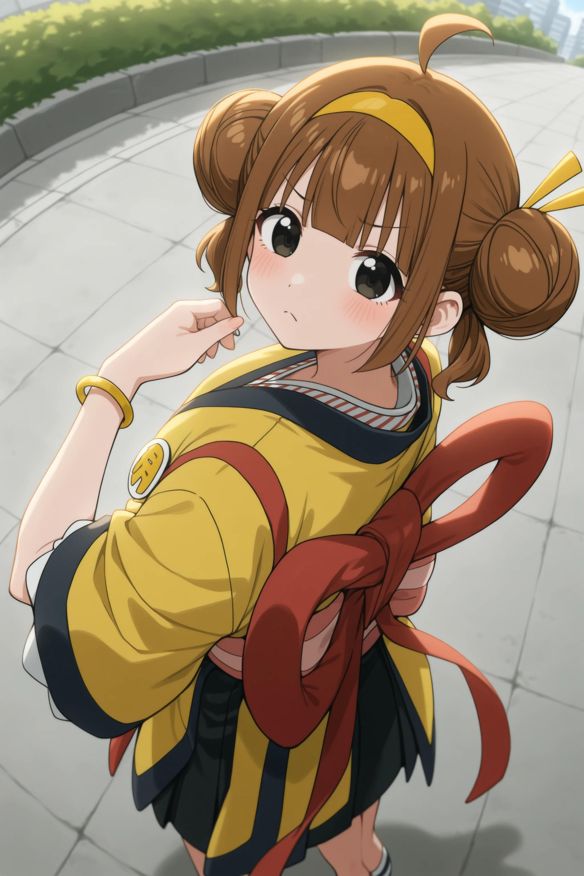 Face area: brown hair, double bun, hair bun, ahoge, blush, blunt bangs, yellow hairband, black eyes, hair ornament,