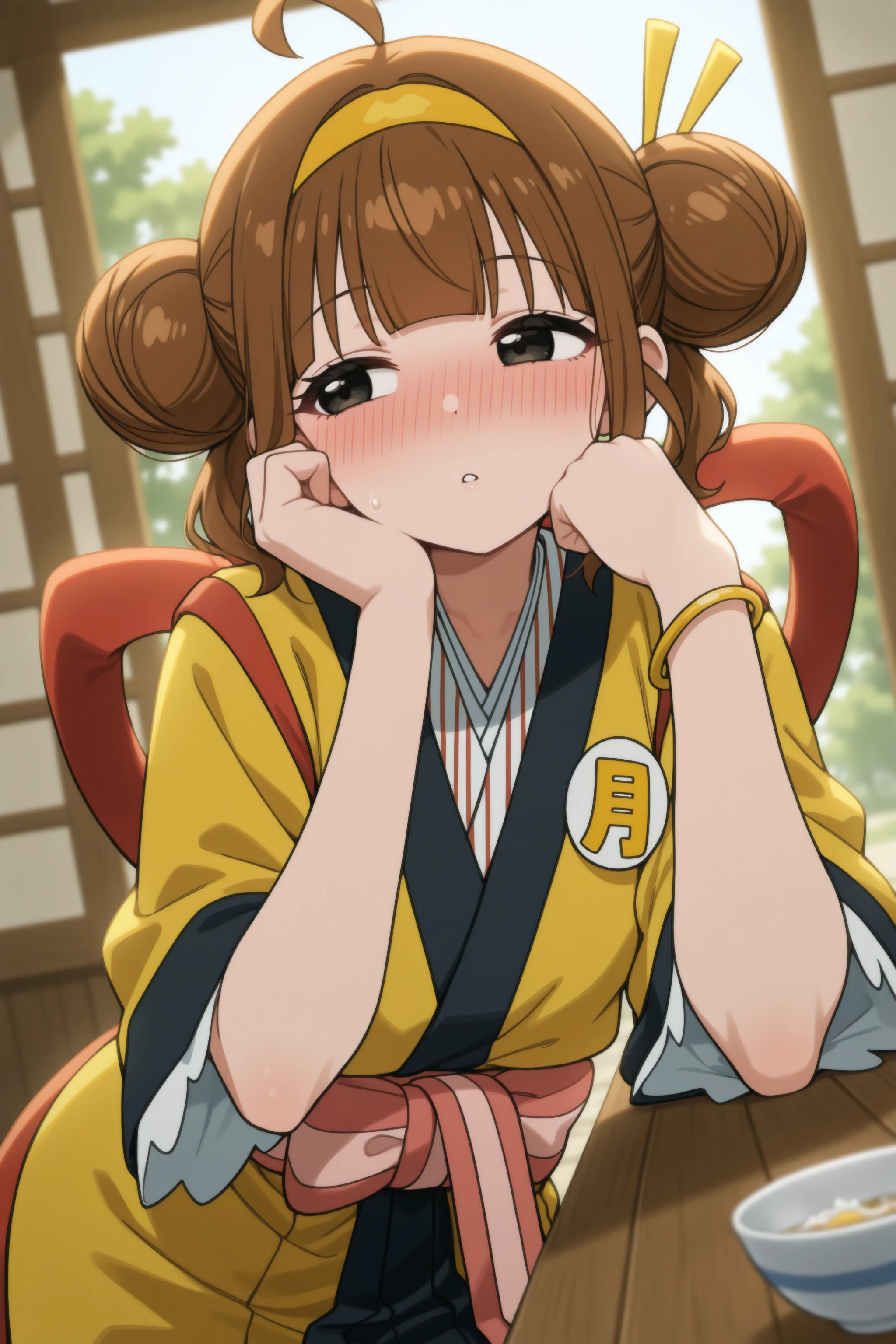 顔周り : brown hair,double bun,hair bun,ahoge,blush,blunt bangs,yellow hairband,black eyes,hair ornament,
