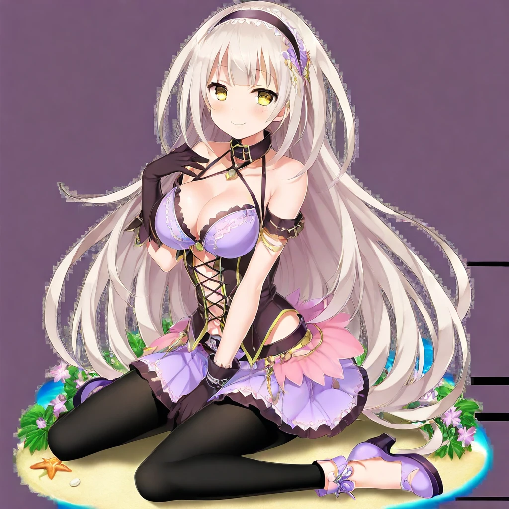 physostegia \(flower knight girl\), blonde hair, long hair, bangs, yellow eyes, hairband, collar, halterneck dress, skirt, straps, corset, pantyhose, singular glove, heels, large breasts, 1girl, solo