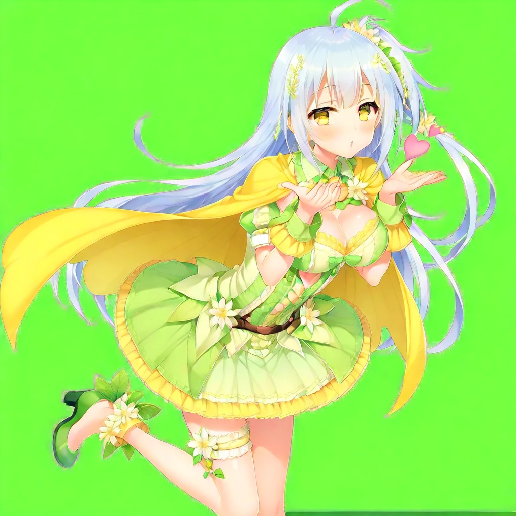 lemon \(flower knight girl\), light blue hair, green and blonde streak in hair, long hair, bangs, side ponytail, ahoge, yellow eyes, flower in hair, yellow cape, green and white dress, skirt, thigh strap, heels, large breasts, 1girl, solo