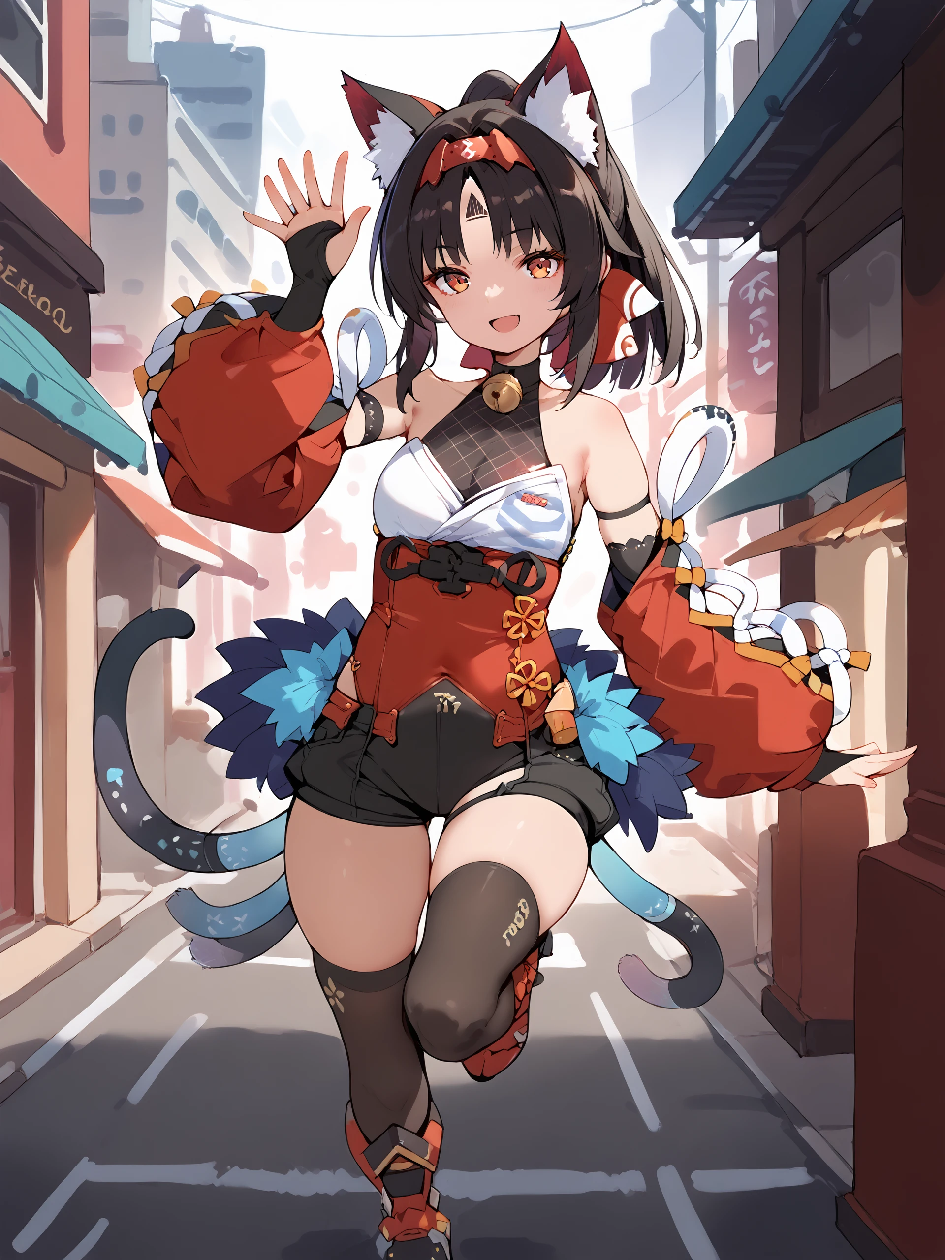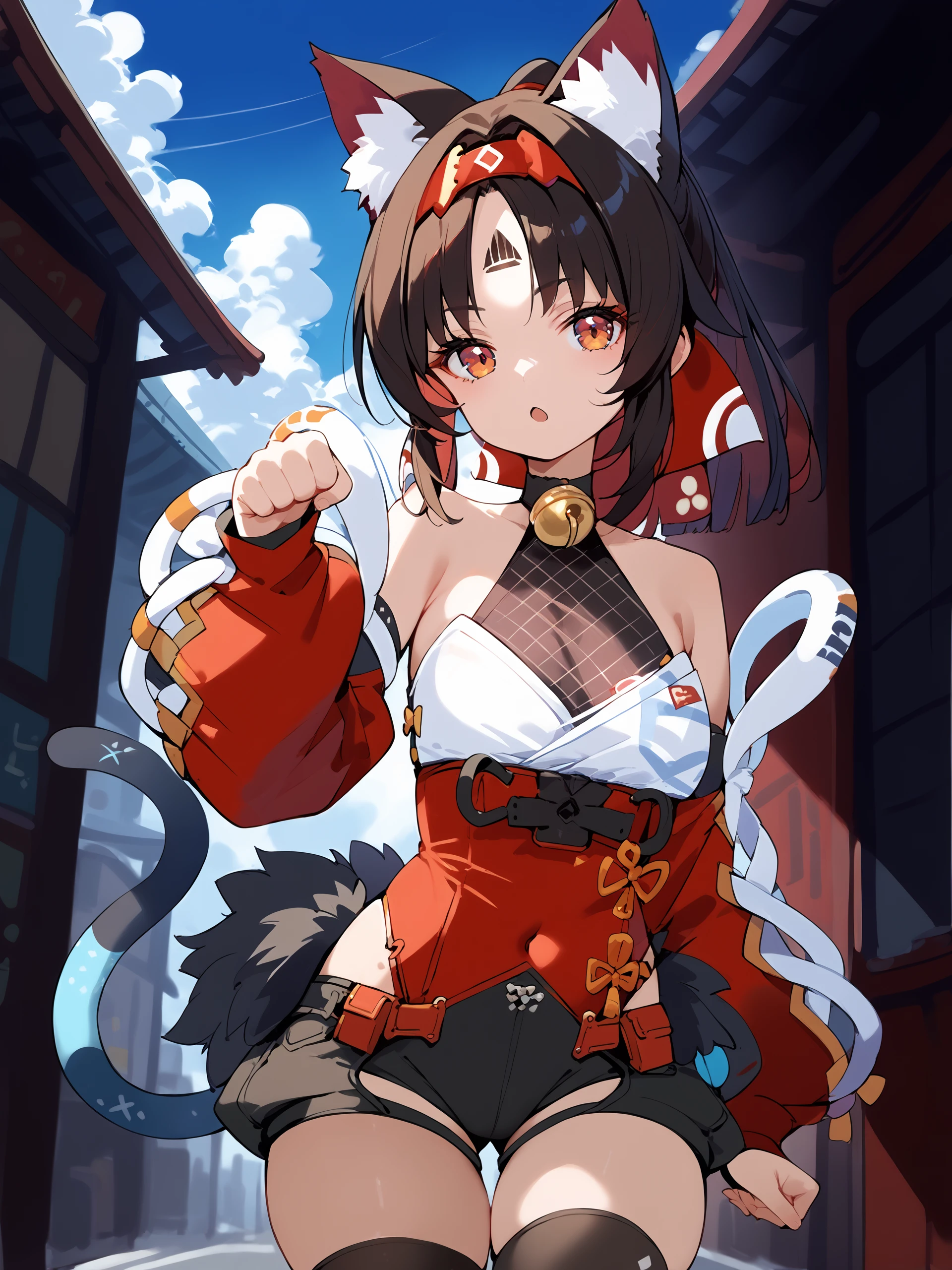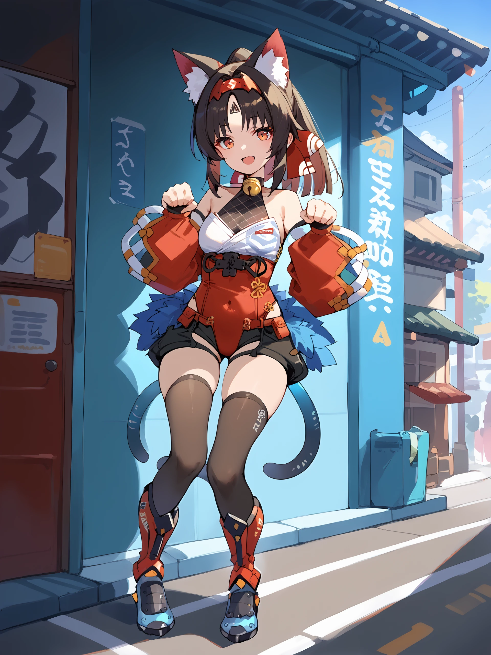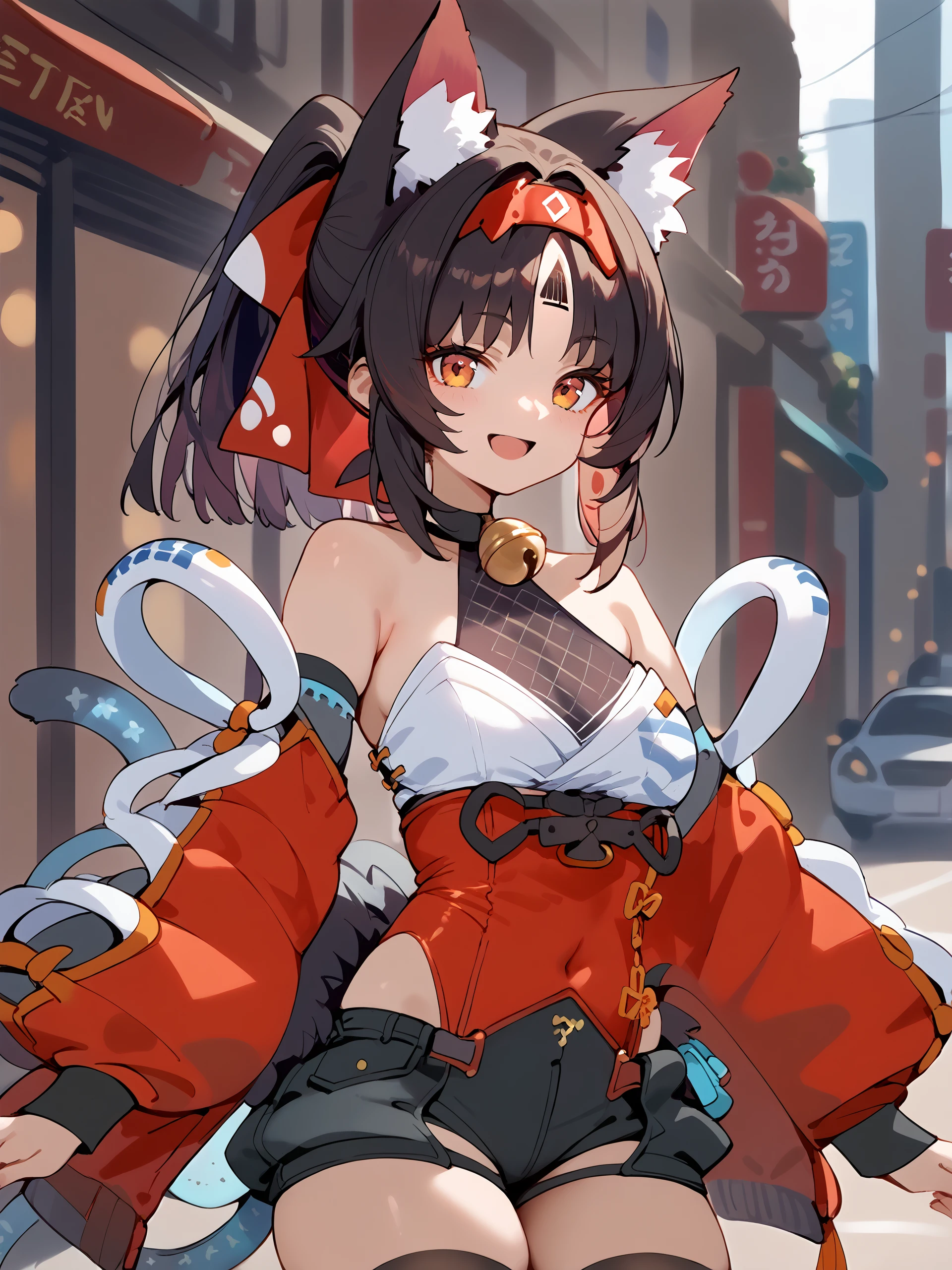 Additional prompts for her default in-game maid costume: neck bell, hairband, two tails, detached sleeves, black thighhighs, ponytail, red leotard, leotard under clothes, black shorts, hair ribbon, mechanical boots, forehead mark
