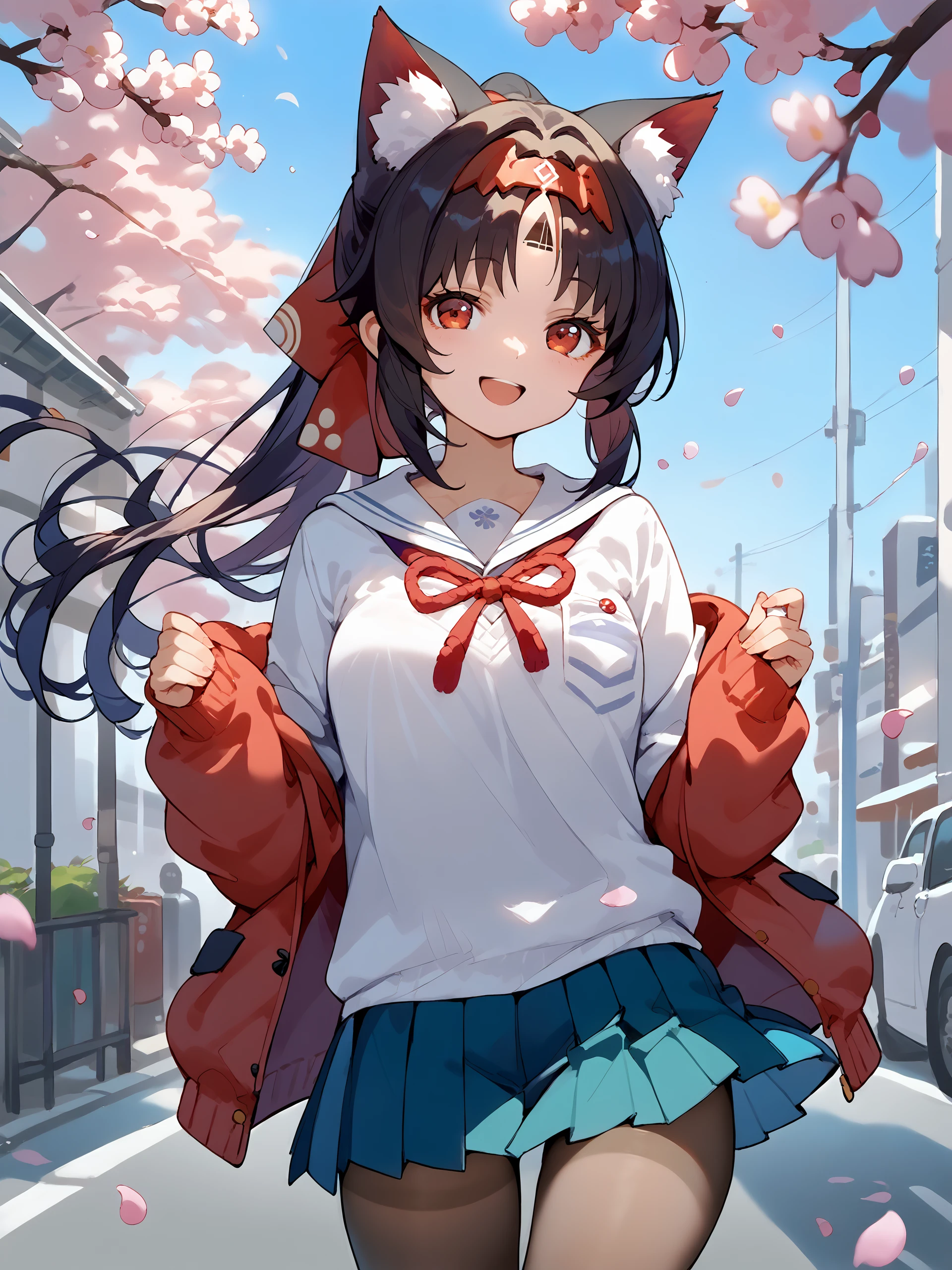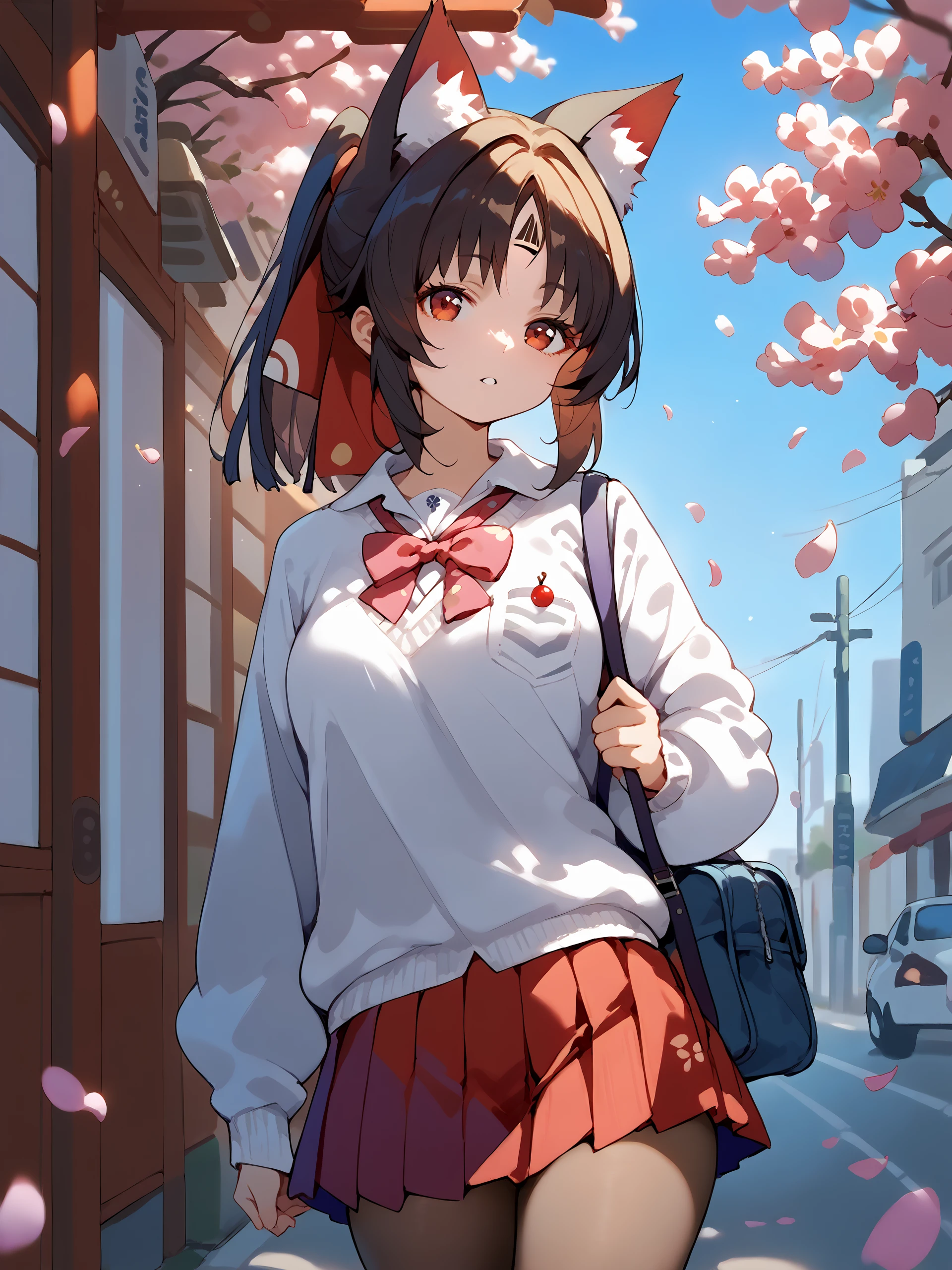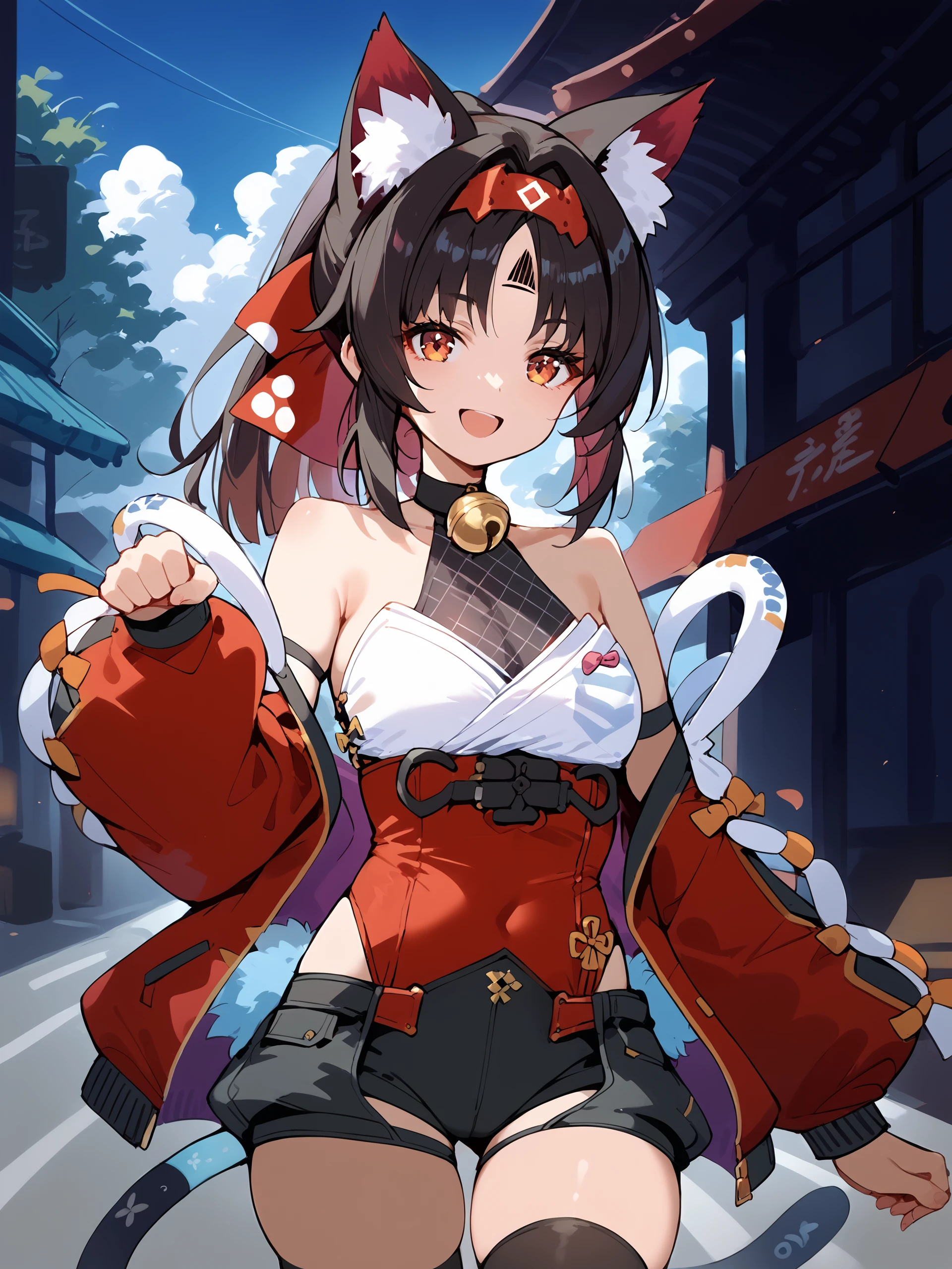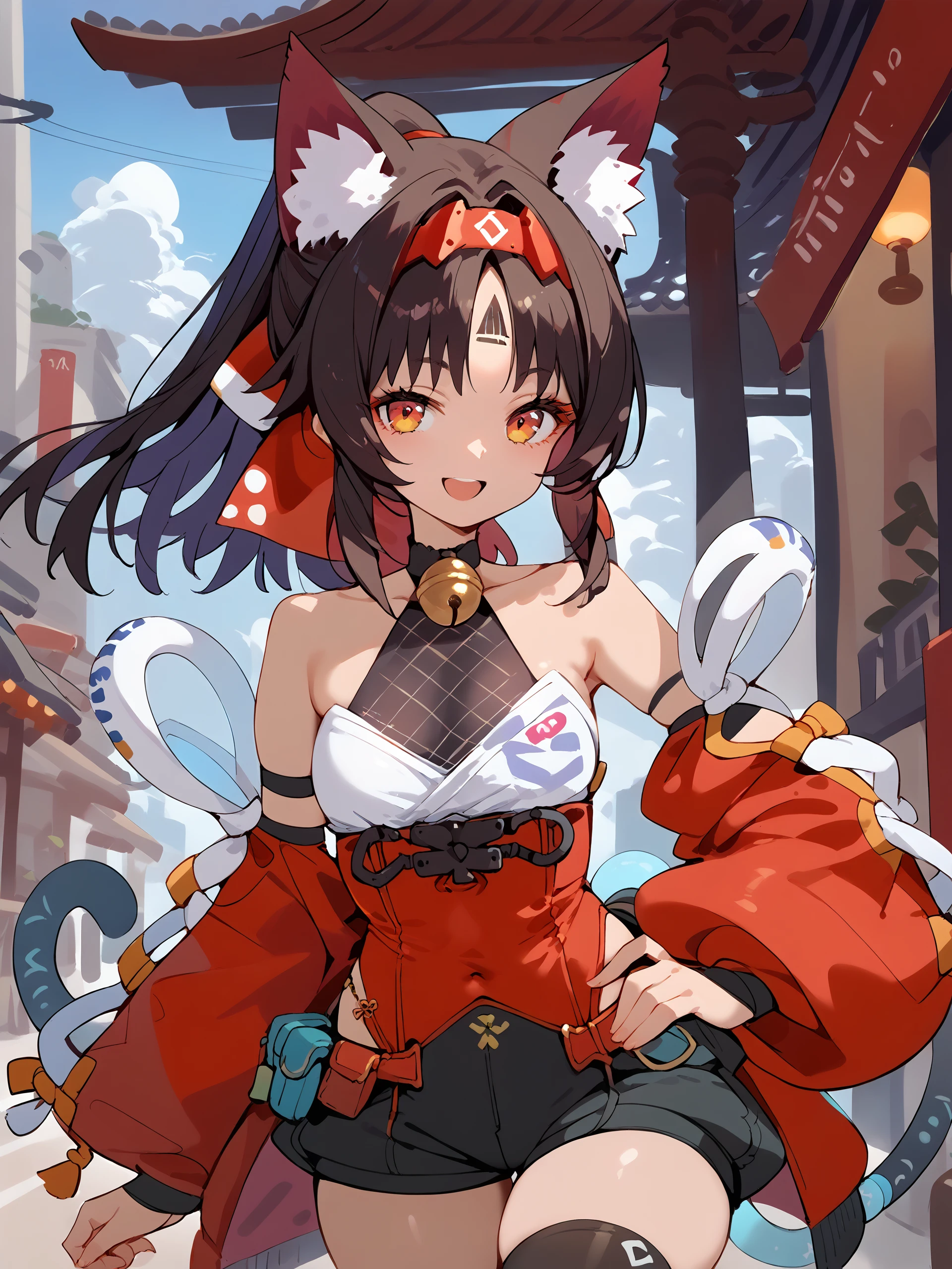 Additional prompts for her default in-game maid costume: neck bell, hairband, two tails, detached sleeves, black thighhighs, ponytail, red leotard, leotard under clothes, black shorts, hair ribbon, mechanical boots, forehead mark