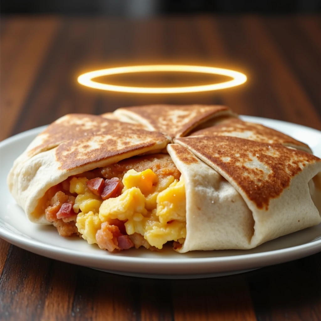 Prompt: an open breakfast crunchwrap with cross section of layered ingredients with fillings of (INGREDIENTS) inside a folded grilled toasted tortilla