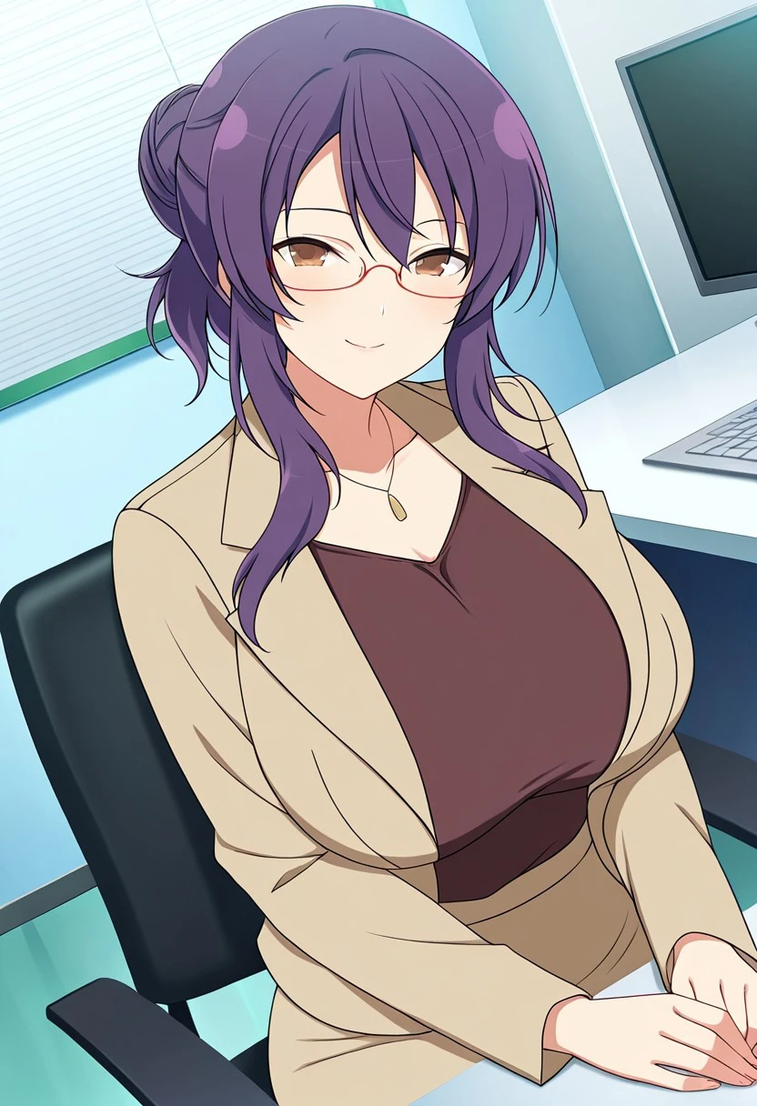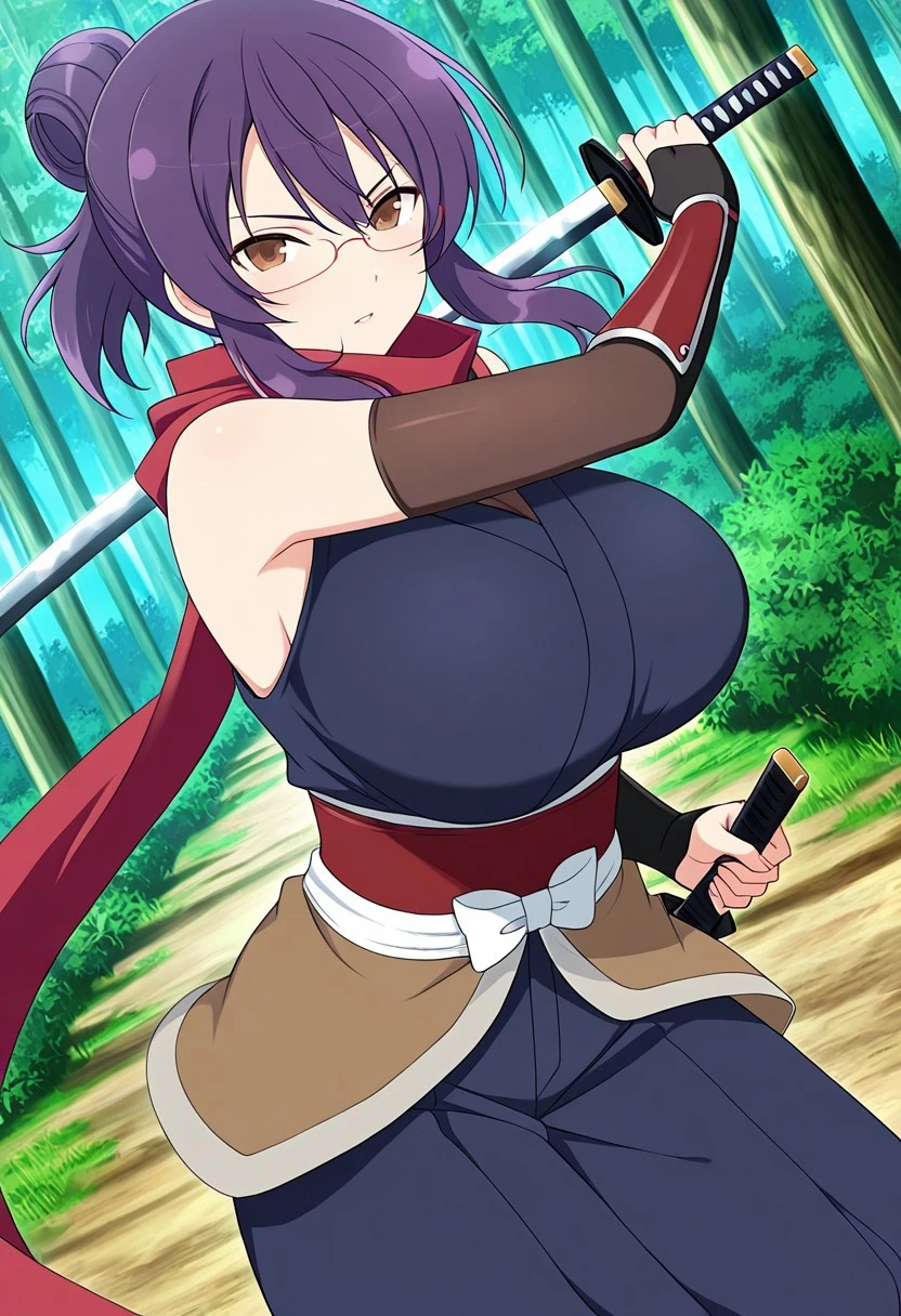 Rin,purple hair, long_hair, hair bun,brown_eyes, huge_breasts, glasses,