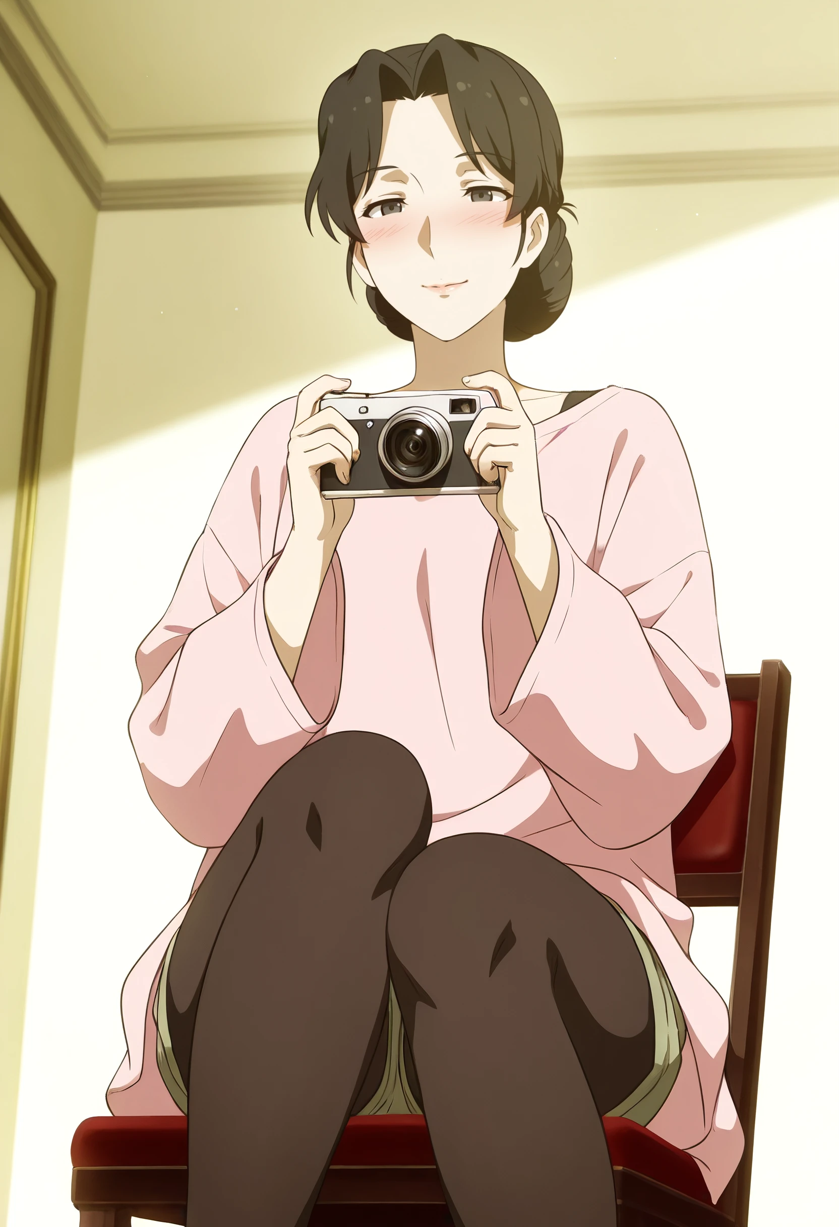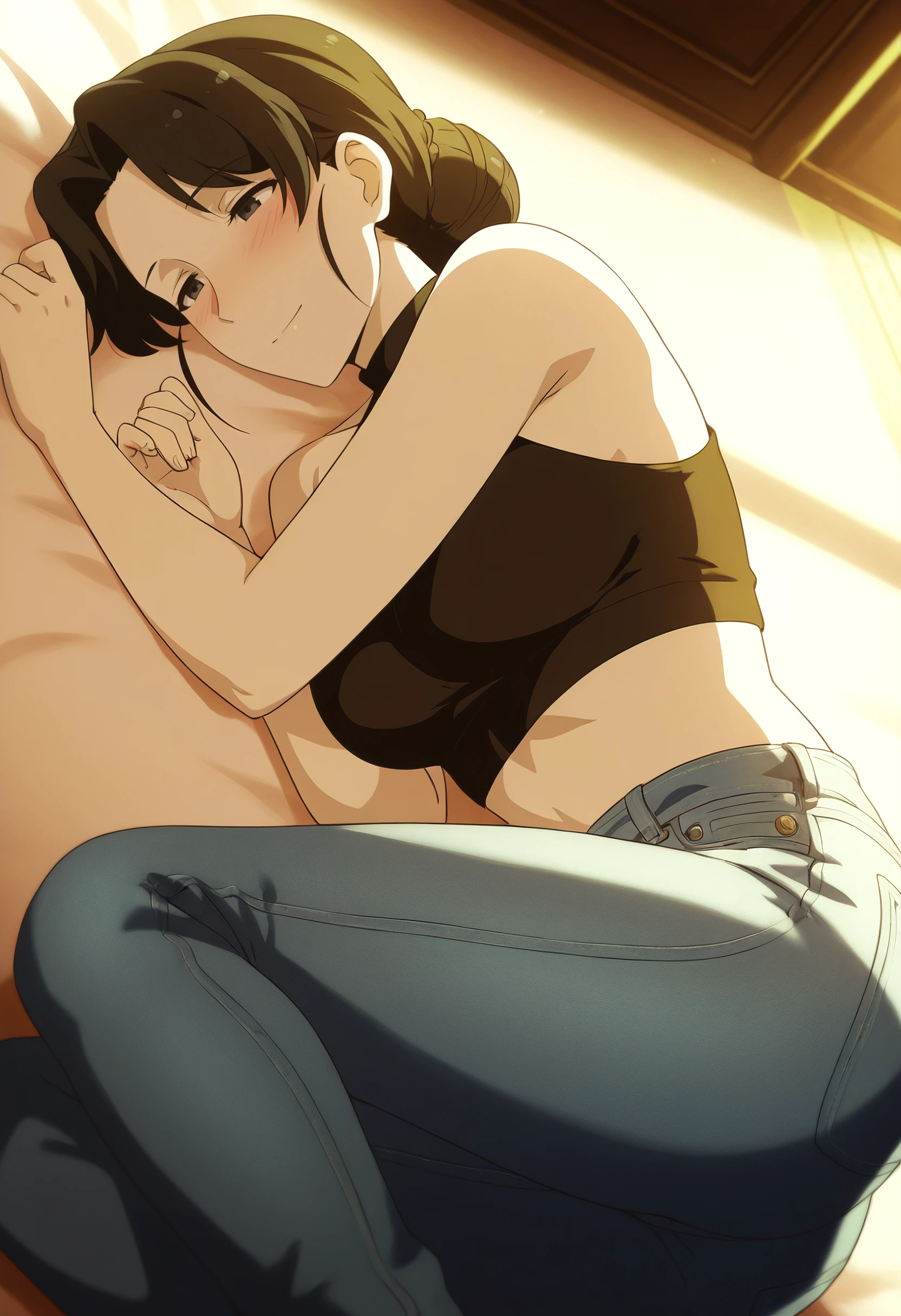 TNMIroha, black hair, short hair, parted bangs, hair bun, single hair bun, black eyes,