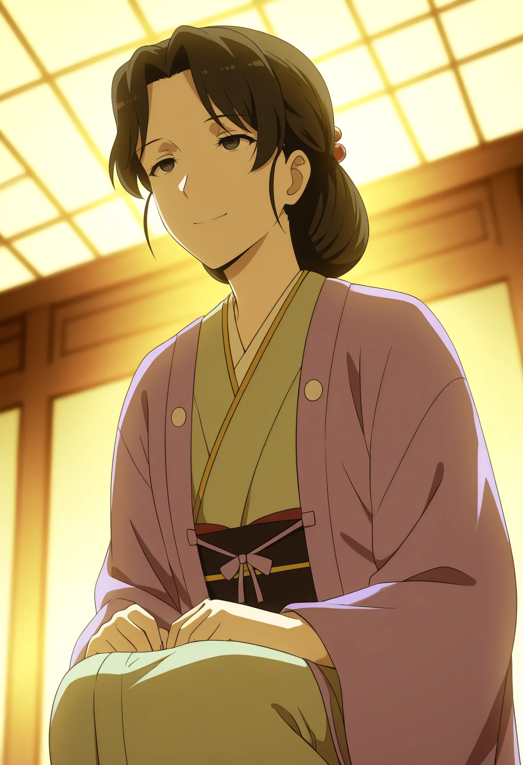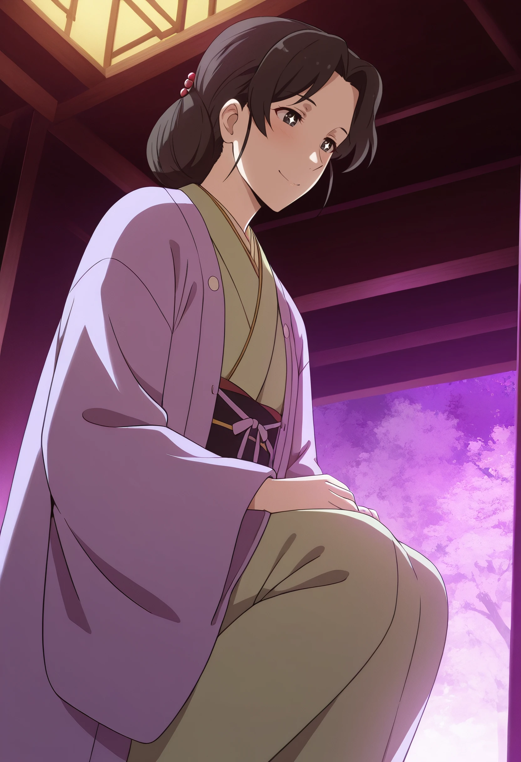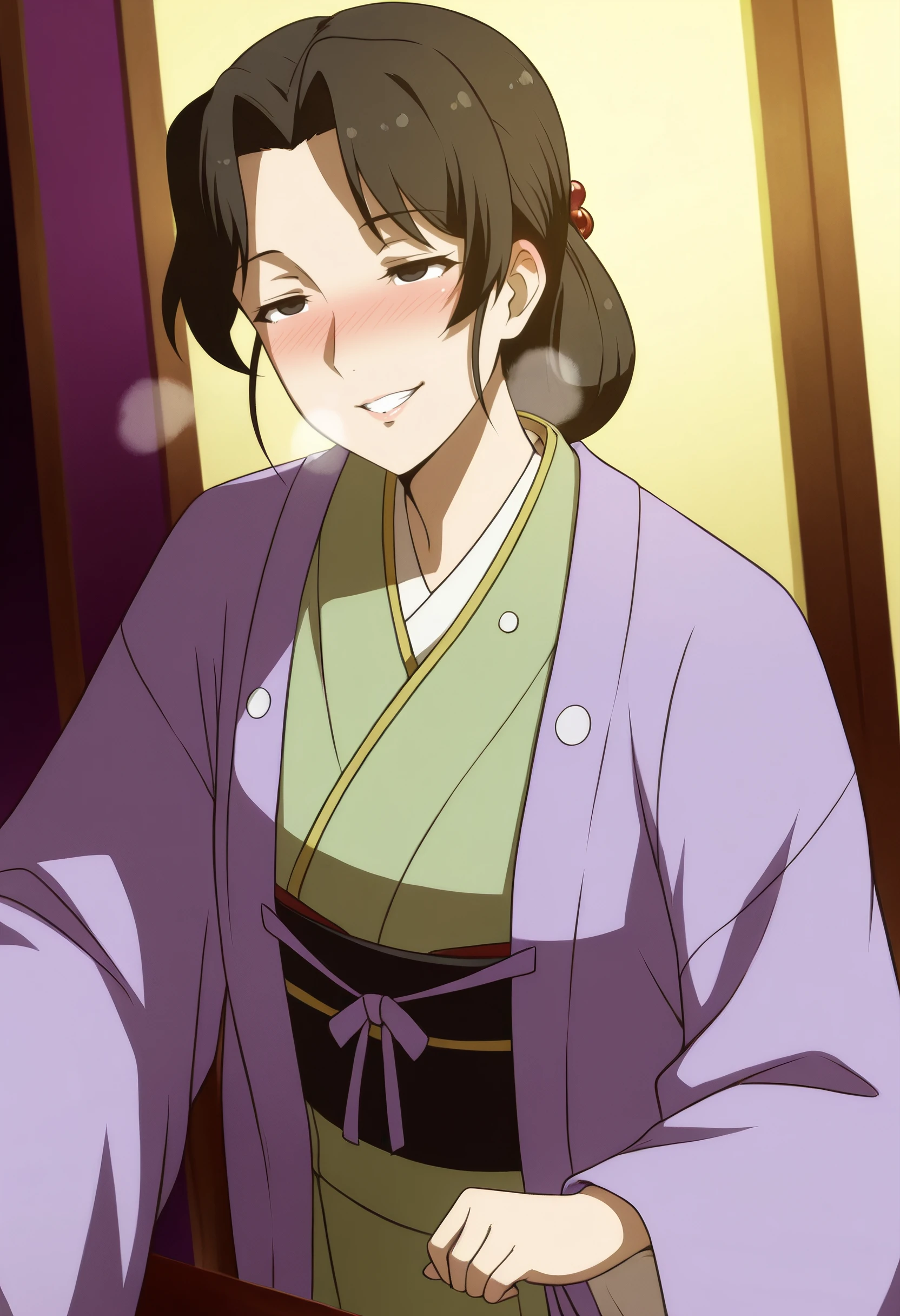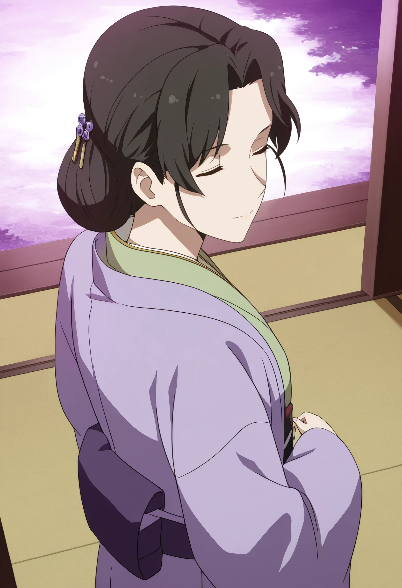 IrohaOutfit, japanese clothes, kimono, haori, green kimono, jacket, obi, sash, long sleeves, wide sleeves, purple kimono, purple jacket, hanten (clothes), open clothes, folded ponytail, hair ornament,