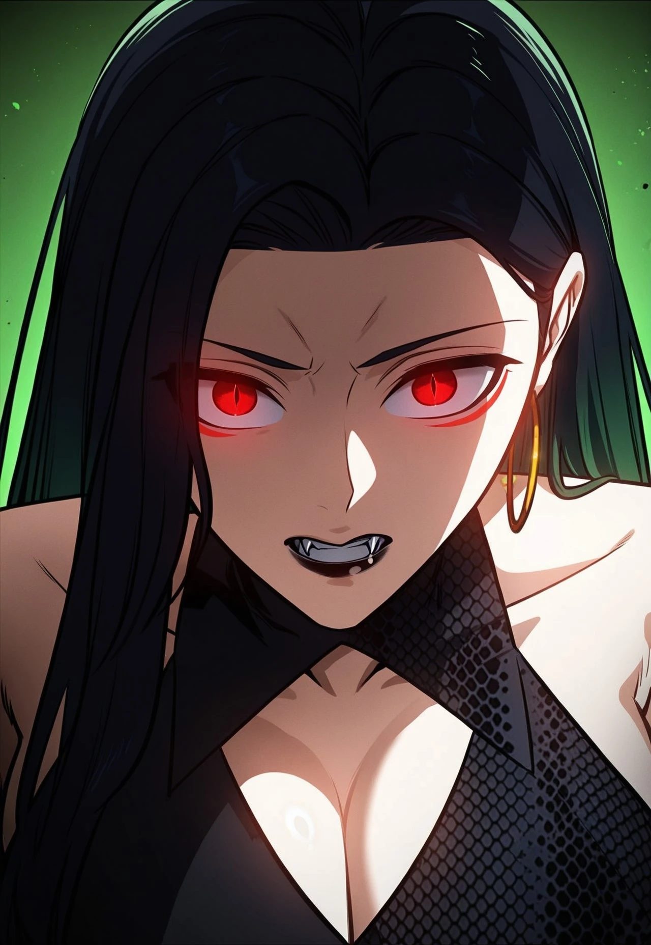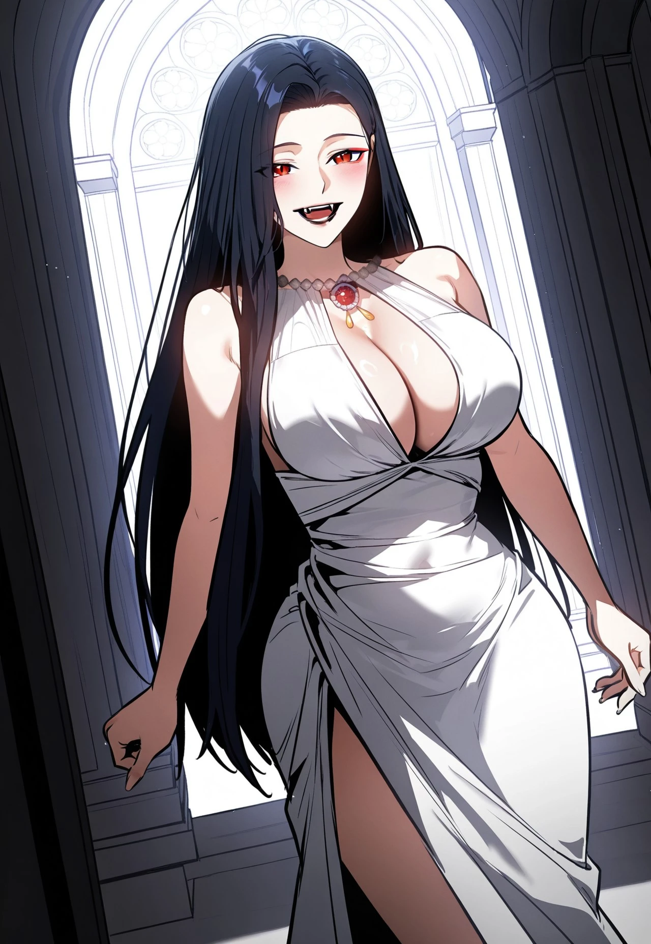 1girl, k4trin4_dwk, long straight, black hair, waist-length hair, center part hair, face-framing front strands, tucked hair behind one ear, sharp eyes, bright crimson irises, slit pupils, red lower eyeliner, thin arched eyebrows, black lipstick, vampire fangs, tall female, hourglass figure, long legs, narrow waist, wide hips,