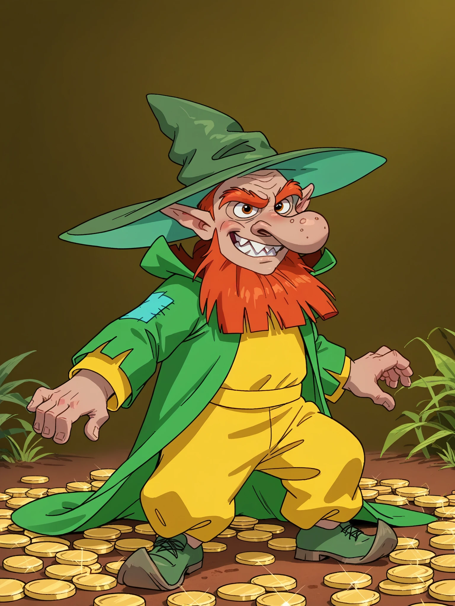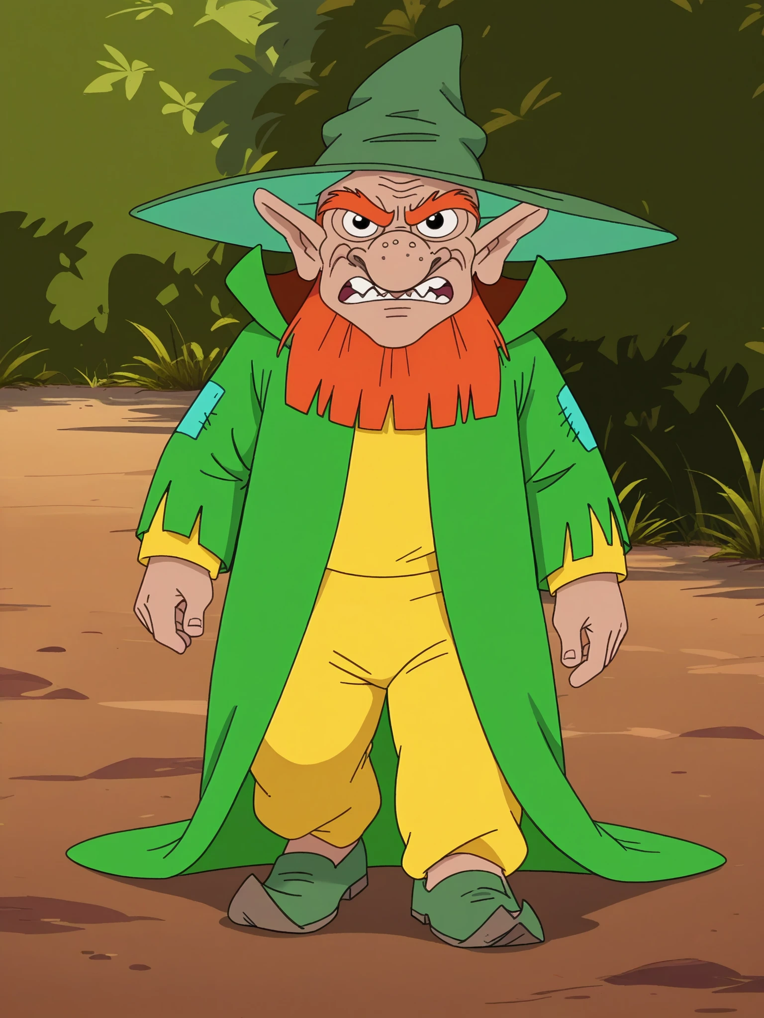 Add-Ons: 1boy, solo, gnome, pointy ears, bulbus nose, bushy eyebrows, red hair, beard, green hat, witch hat, green cloak, high collar, blue patch, yellow shirt, yellow pants, green shoe, sharp teeth, size difference