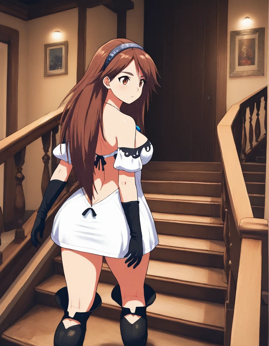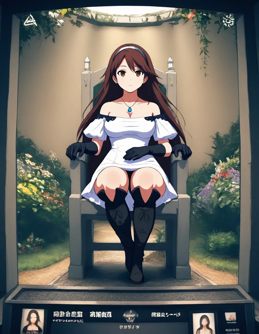 Agnes_Oblig3, hairband, white_dress, black_leggings, black_boots, pendant, gloves, brown_hair, brown_eyes, (anime style)