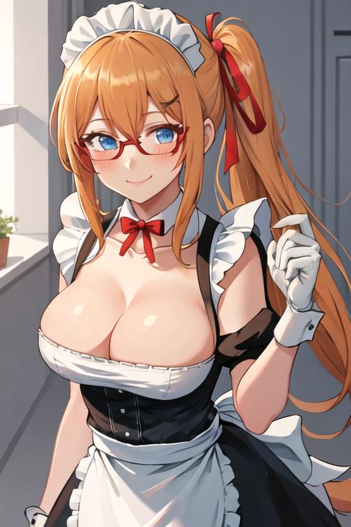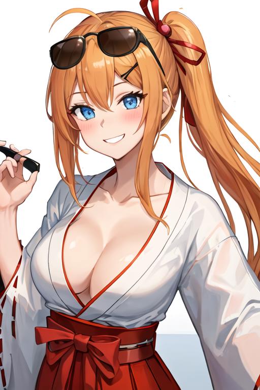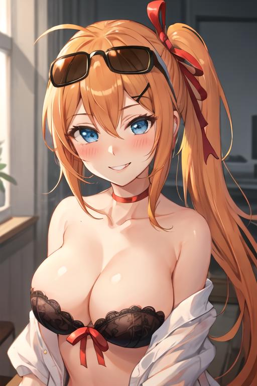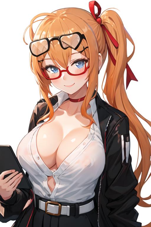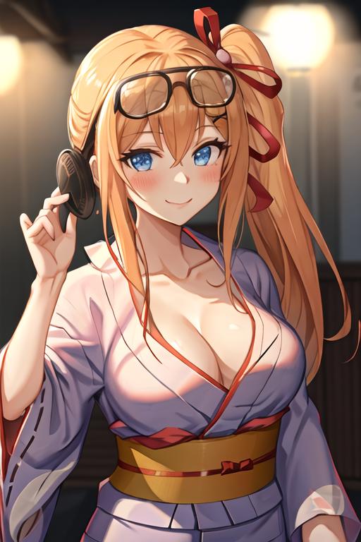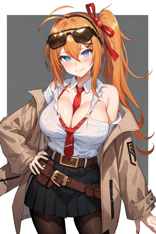 The trigger word is kalina_girlsfrontline, and the recommended tags are best quality, masterpiece, highres, solo, {kalina_girlsfrontline:1.15}, blue_eyes, long_hair, orange_hair, hair_between_eyes, breasts, side_ponytail, blush, ribbon, hair_ribbon, smile, eyewear_on_head, hair_ornament, bangs, large_breasts, red_ribbon, collarbone, cleavage.
