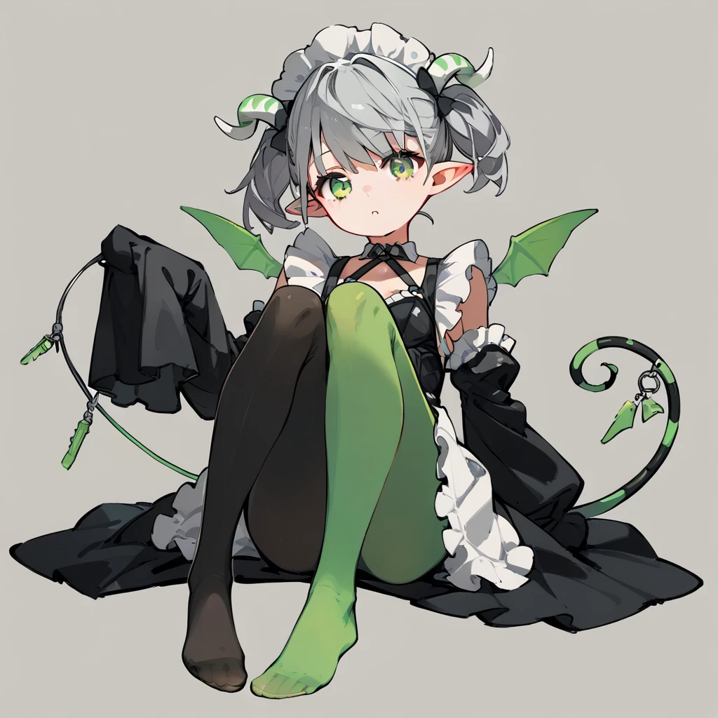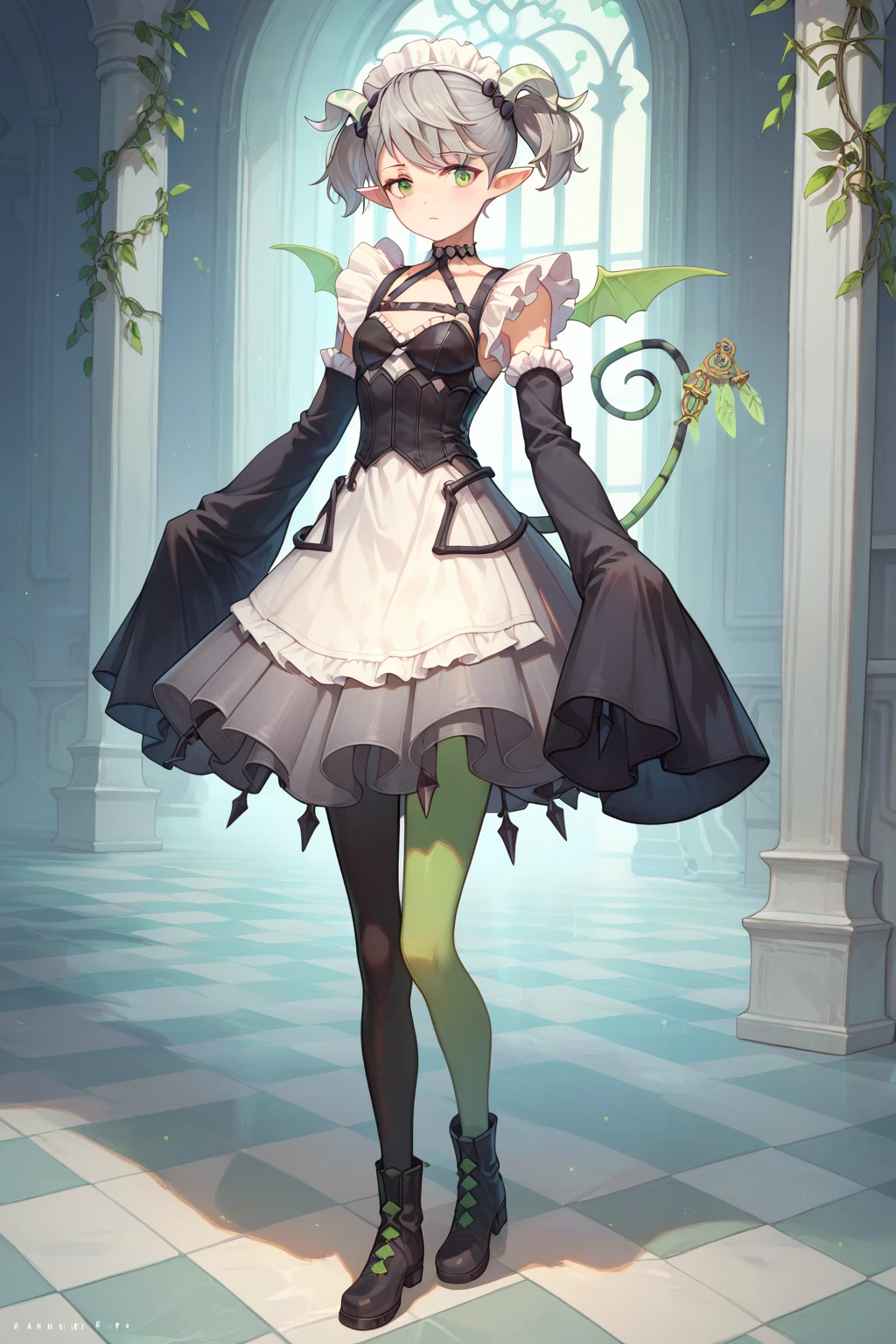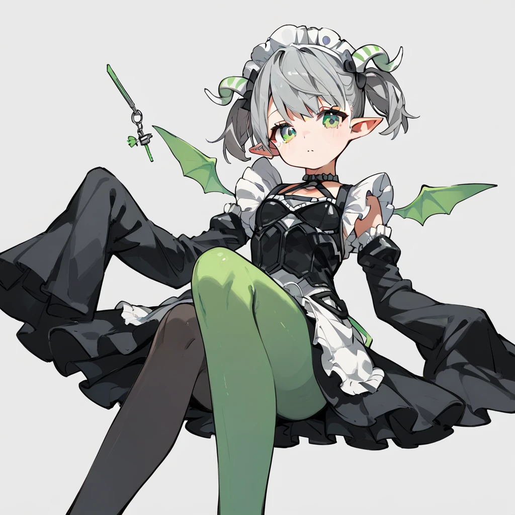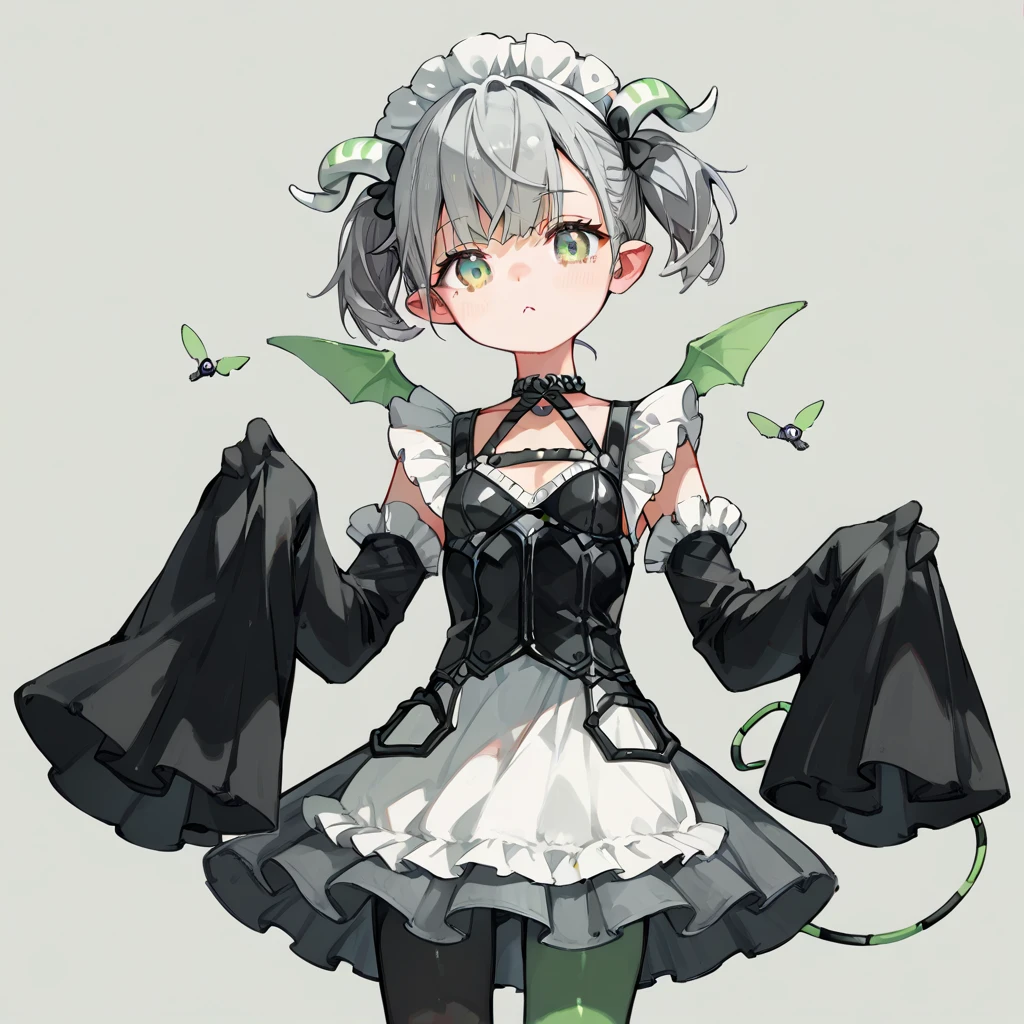 1girl, solo, arianna, grey hair, short twintails, green eyes, horns, mini wings, sleeves past wrists, maid headdress, pointy ears, pantyhose如果你喜欢我的作品,也可以到我的Pixiv来看看: