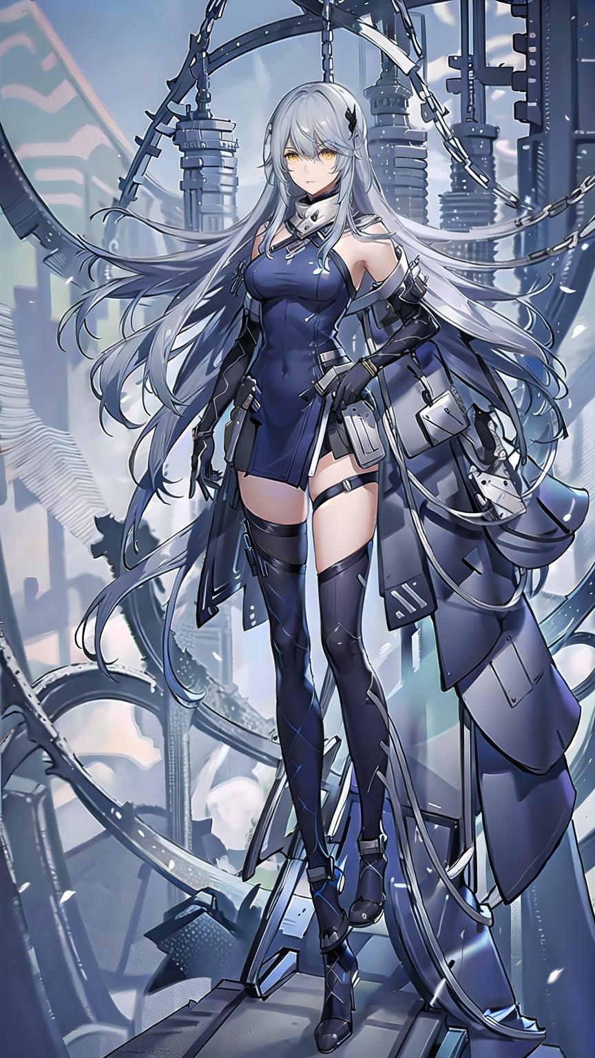 -->Prompts: lyfesnowbreak,black thighhighs,expressionless,dark blue dress,yellow eyes, grey hair,