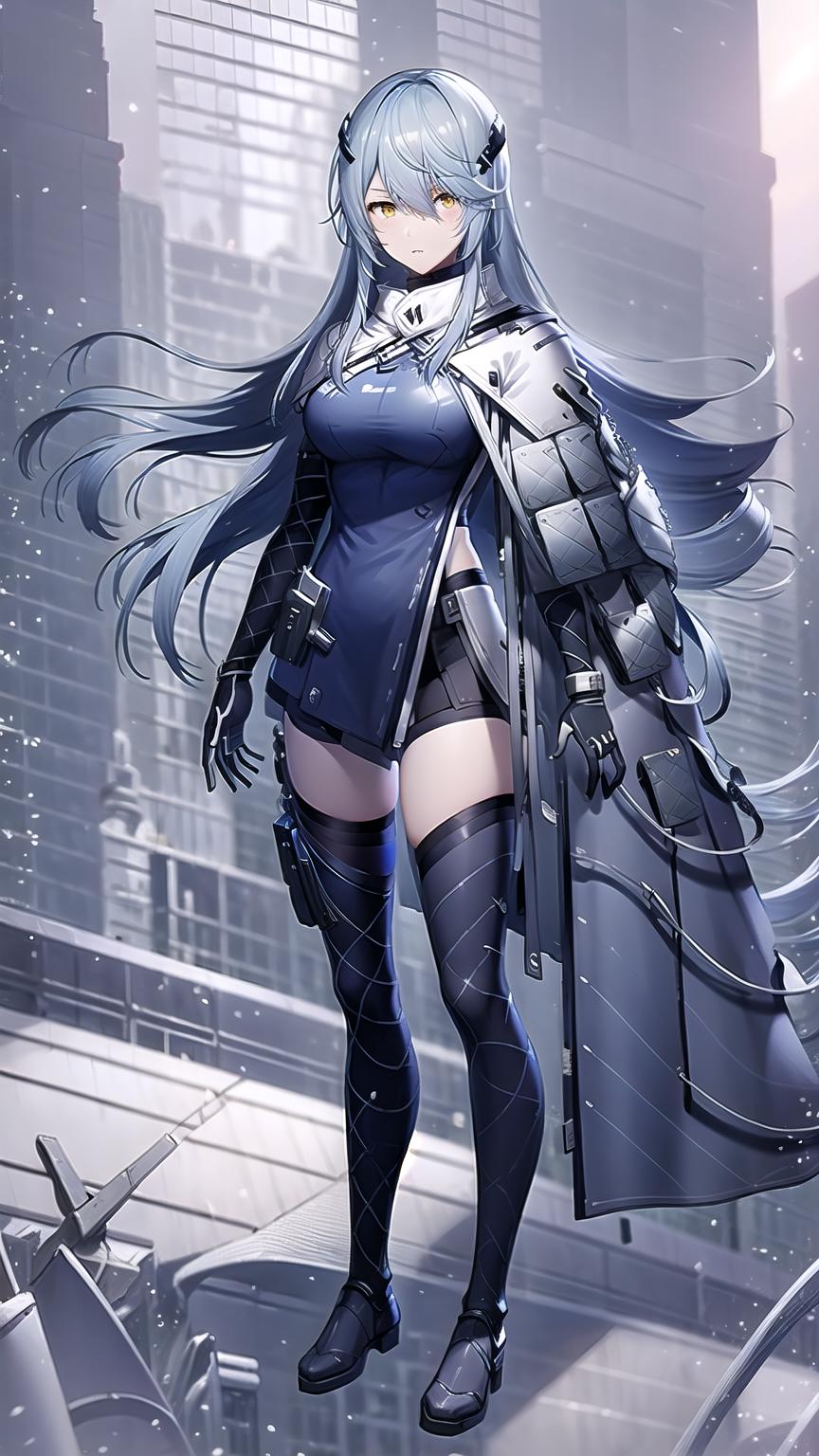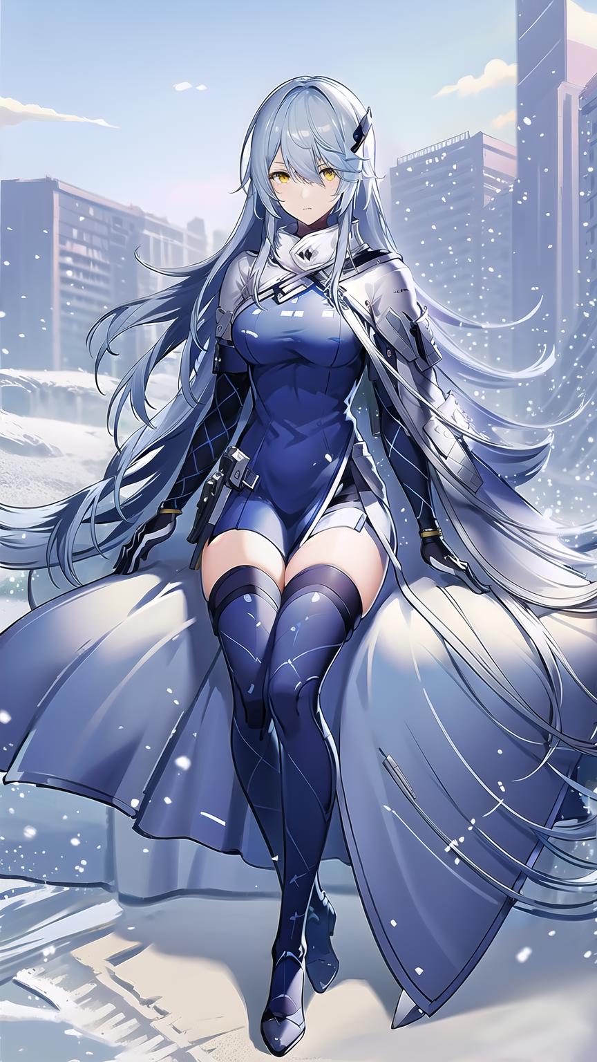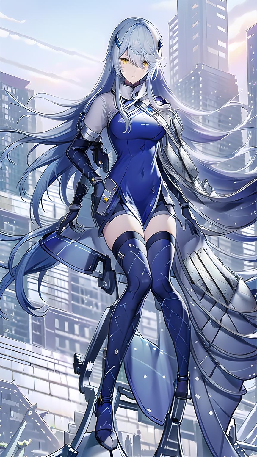 -->プロンプト:lyfesnowbreak,black thighhighs,expressionless,dark blue dress,yellow eyes, grey hair,