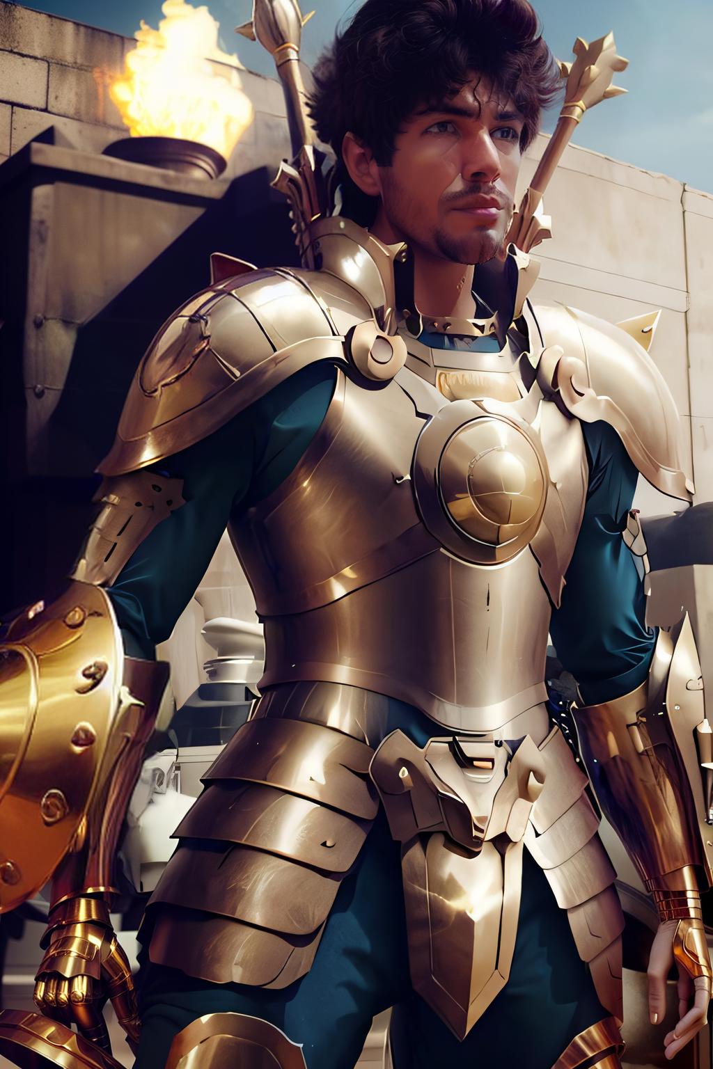 librasaint, golden armor, golden shields,golden weapons on back,full armor, gold armor,polearm