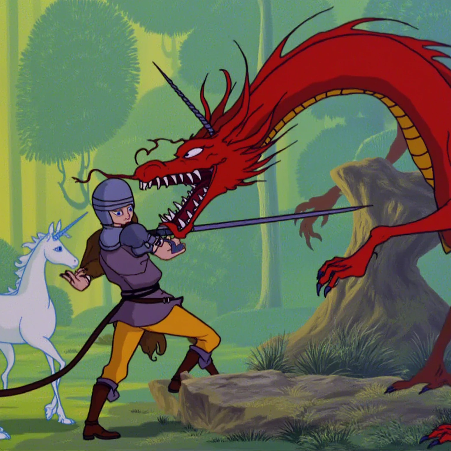 Recreate the enchanting aesthetic of the The Last Unicorn, an animated film by the incredible Rankin-Bass studio that brought you the animated Hobbit film in the late 70s. One could try a prompt similar to this one if one wanted to: