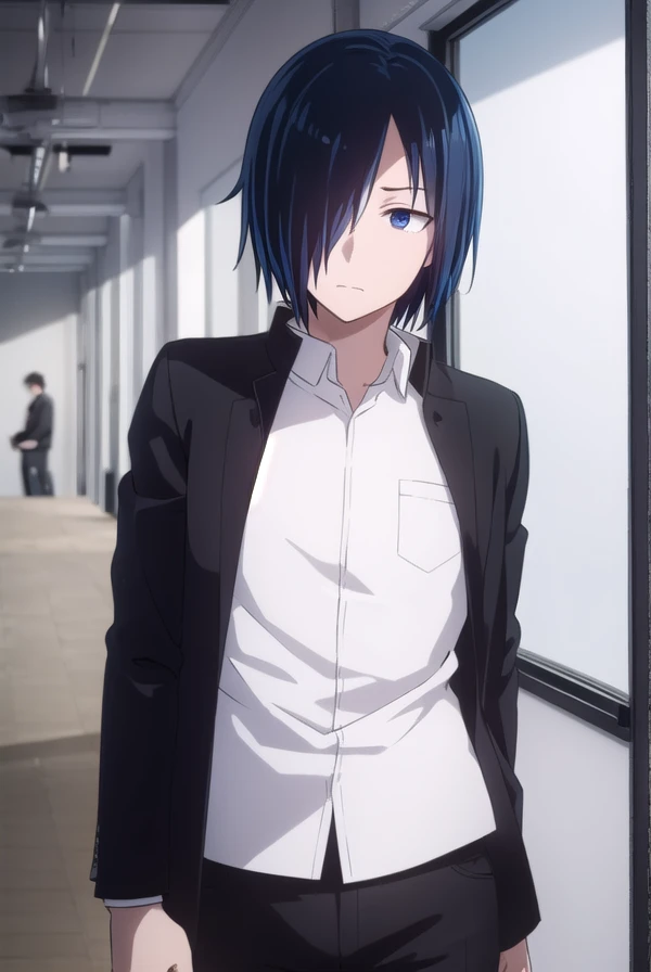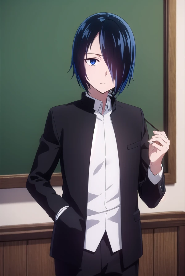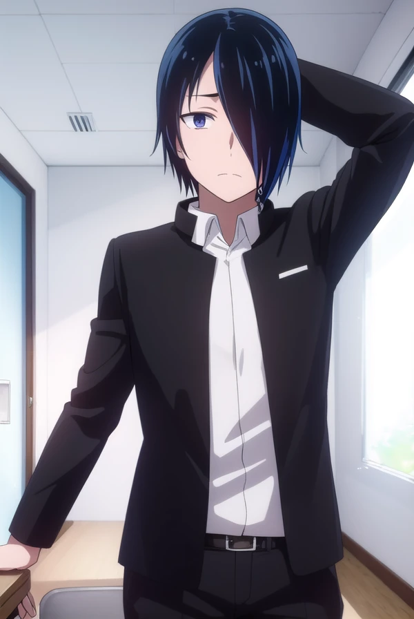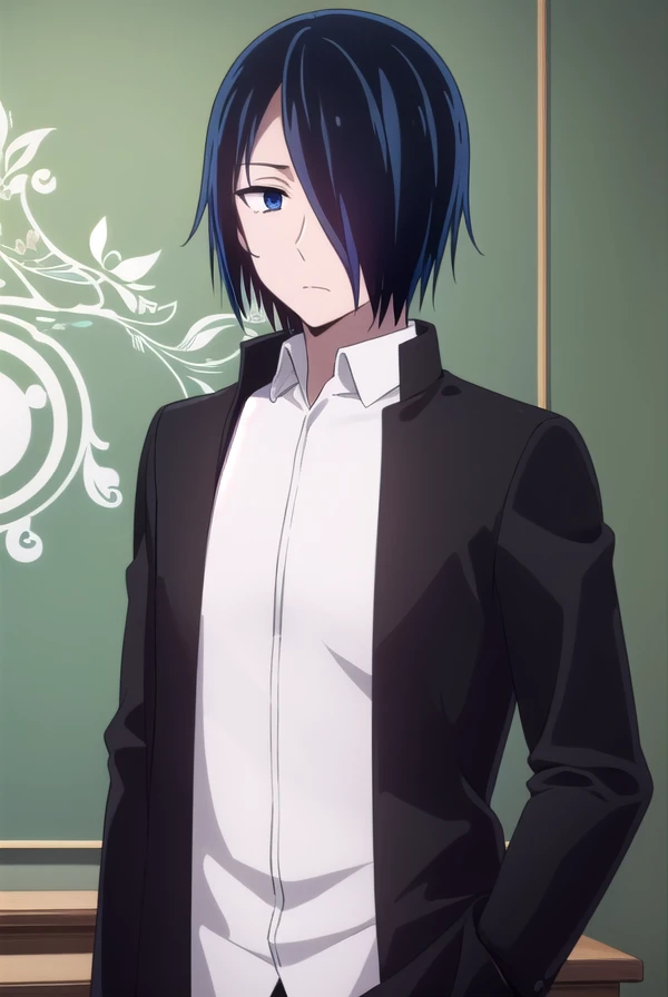 yuu ishigami, black hair, blue hair, male focus, (hair over one eye:1.5), (black eyes:1.3),