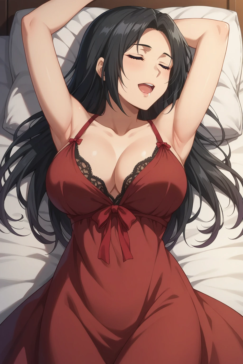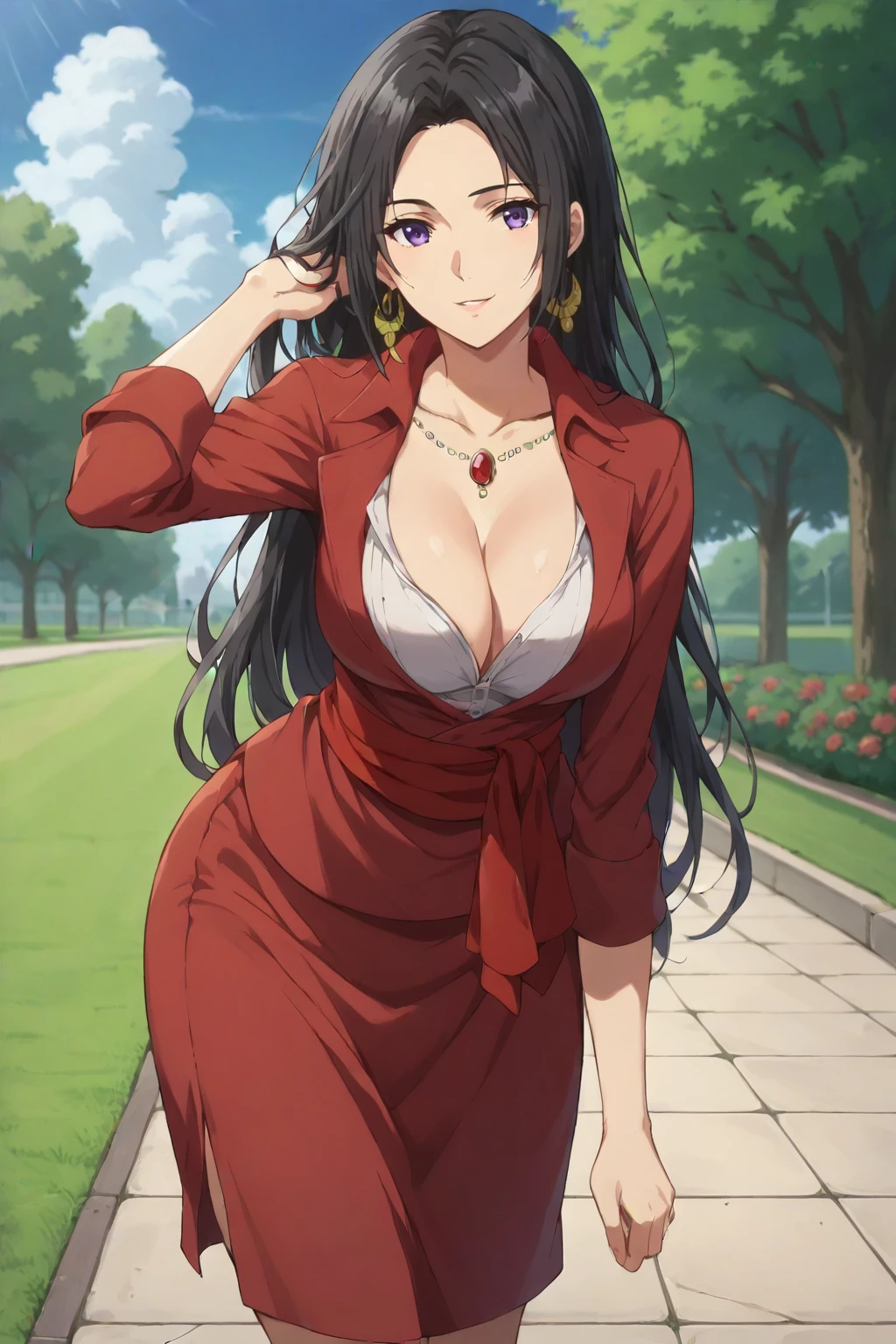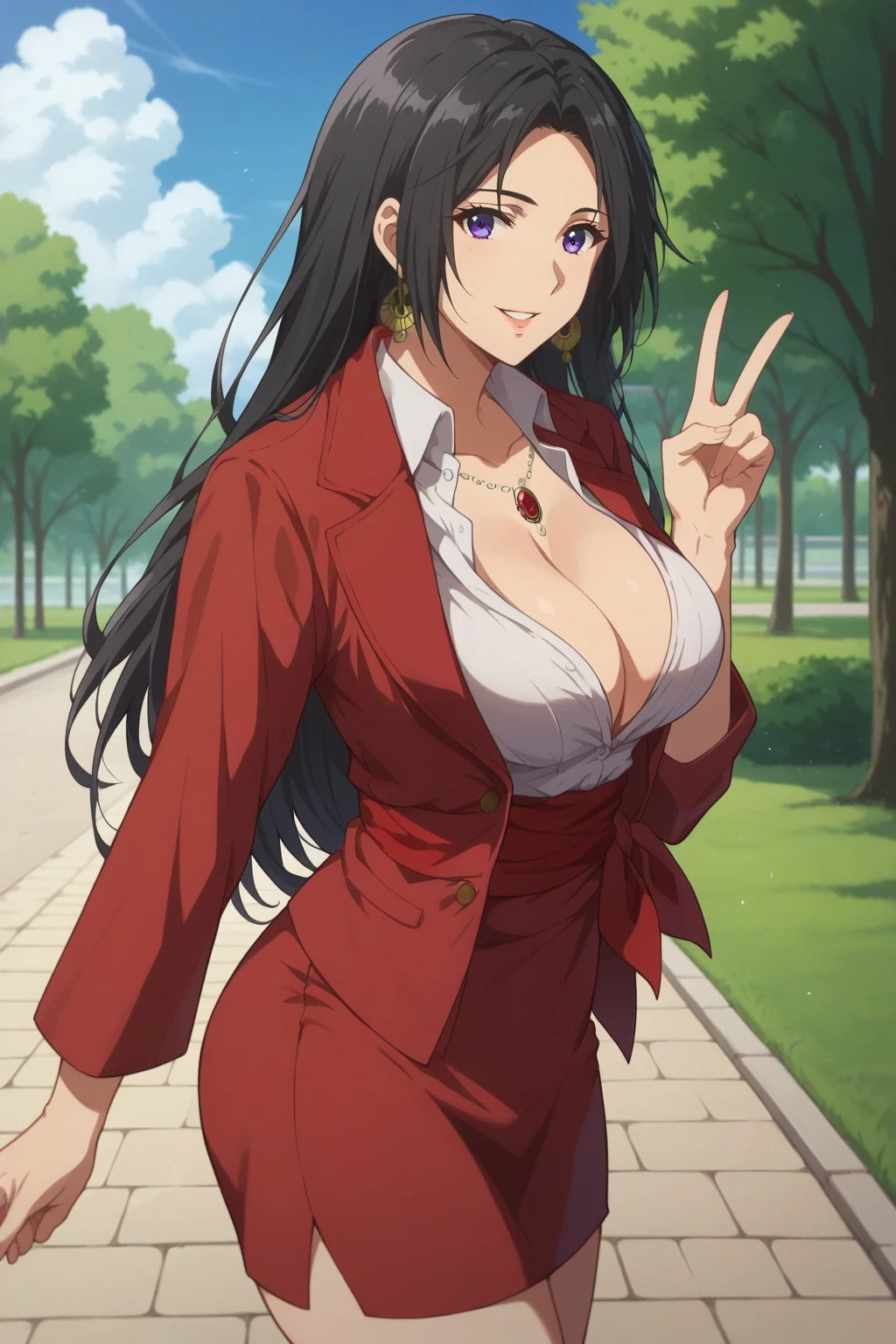Outfit: Red open jacket, red collared shirt, open collared shirt, white shirt, cleavage, red sash, red short skirt, necklace, earrings, knee boots,
