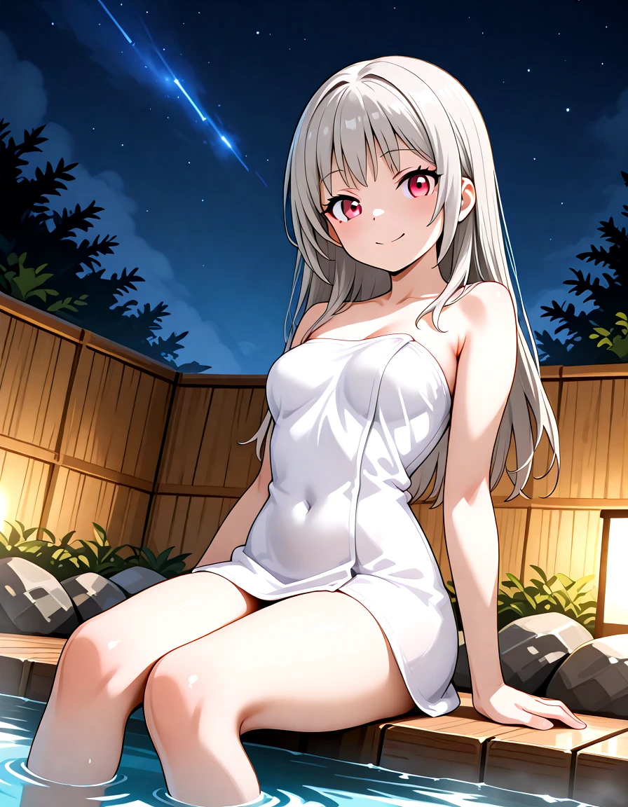 Maiten_qcode, long hair, grey hair, red eyes, two side up, butterfly hair ornament, breastsOutfit