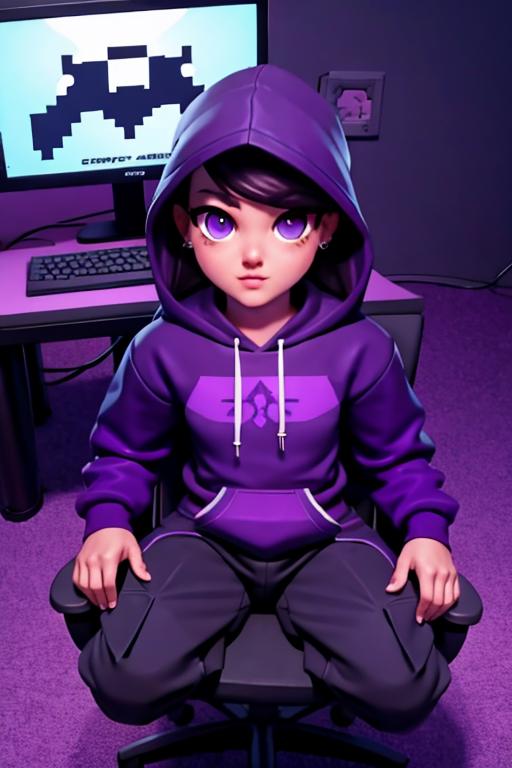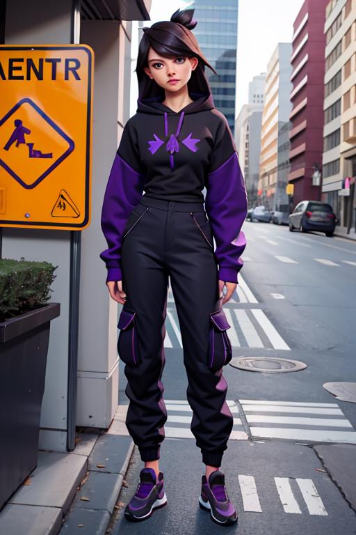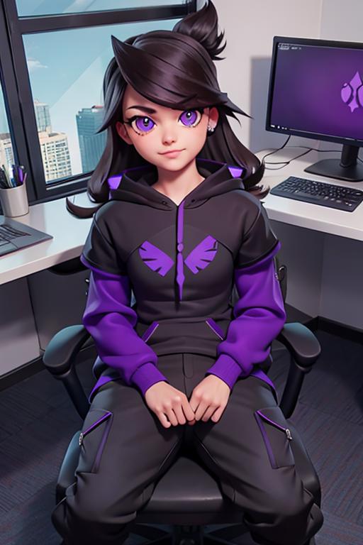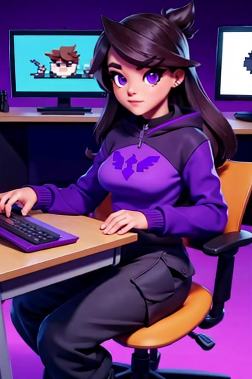 brown pointy hair, purple eyes, (low ponytail:0.6)