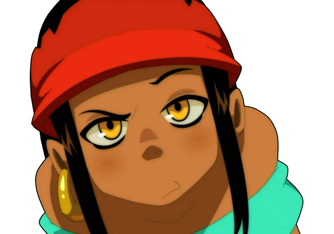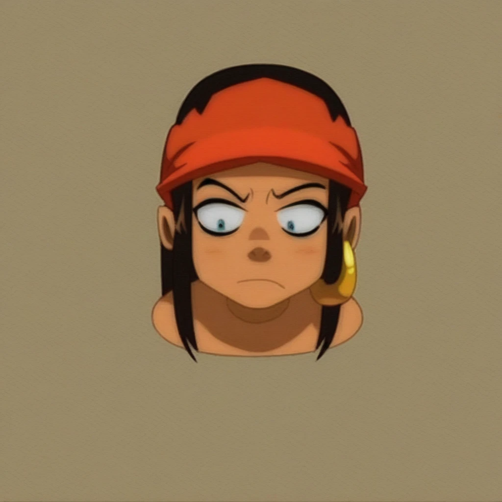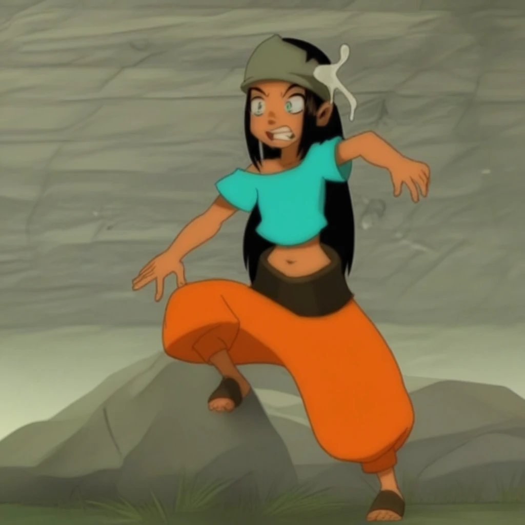 dark tanned skin, amber eyes. long black hair, aqua shirt that exposes shoulders and her midriff, orange harem pants, red bandana, golden earring