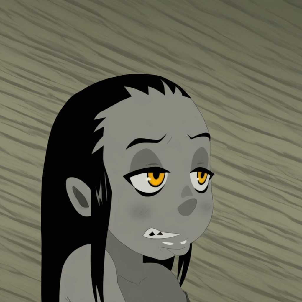 dark tanned skin, amber eyes, long black hair,