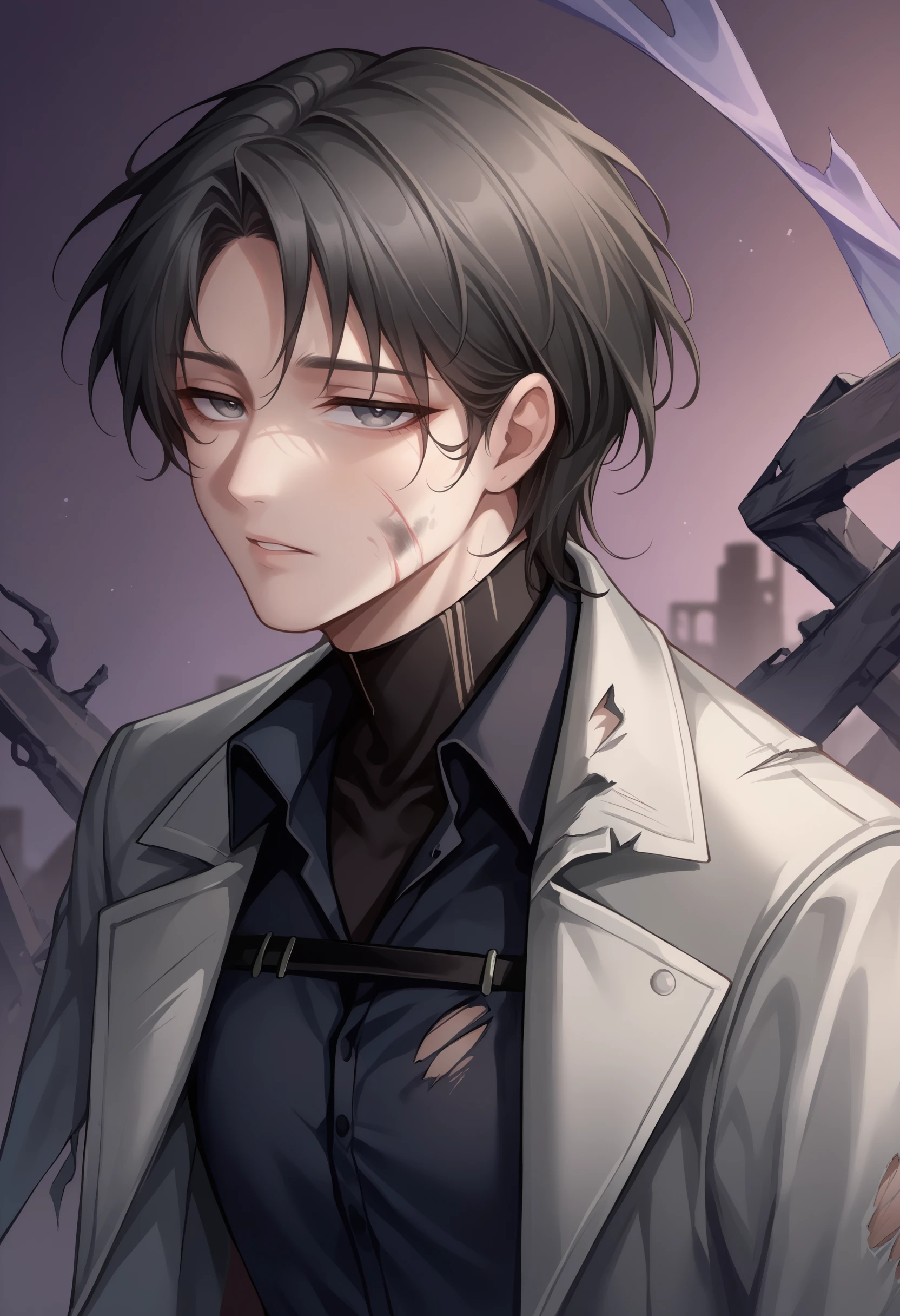 coat on shoulder, grey coat, black shirt, collared shirt, compression shirt, chest harness, belt, grey pants, black shoes - his "default" outfit