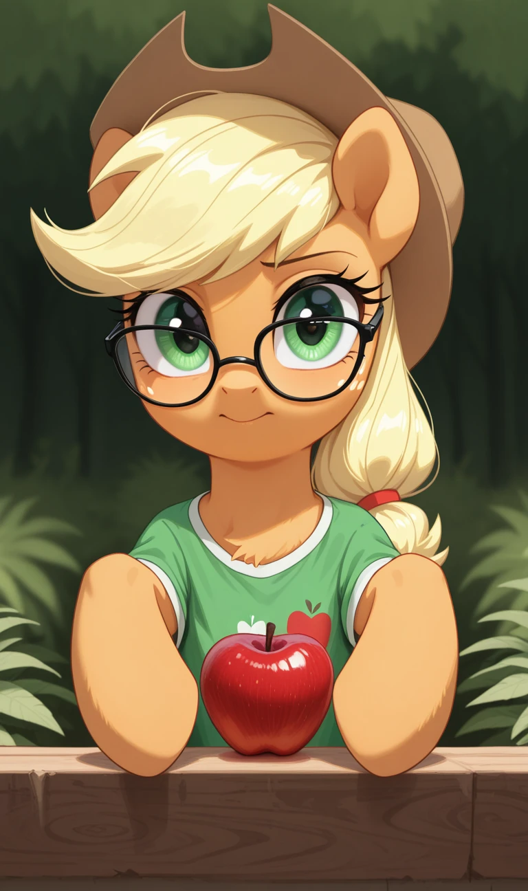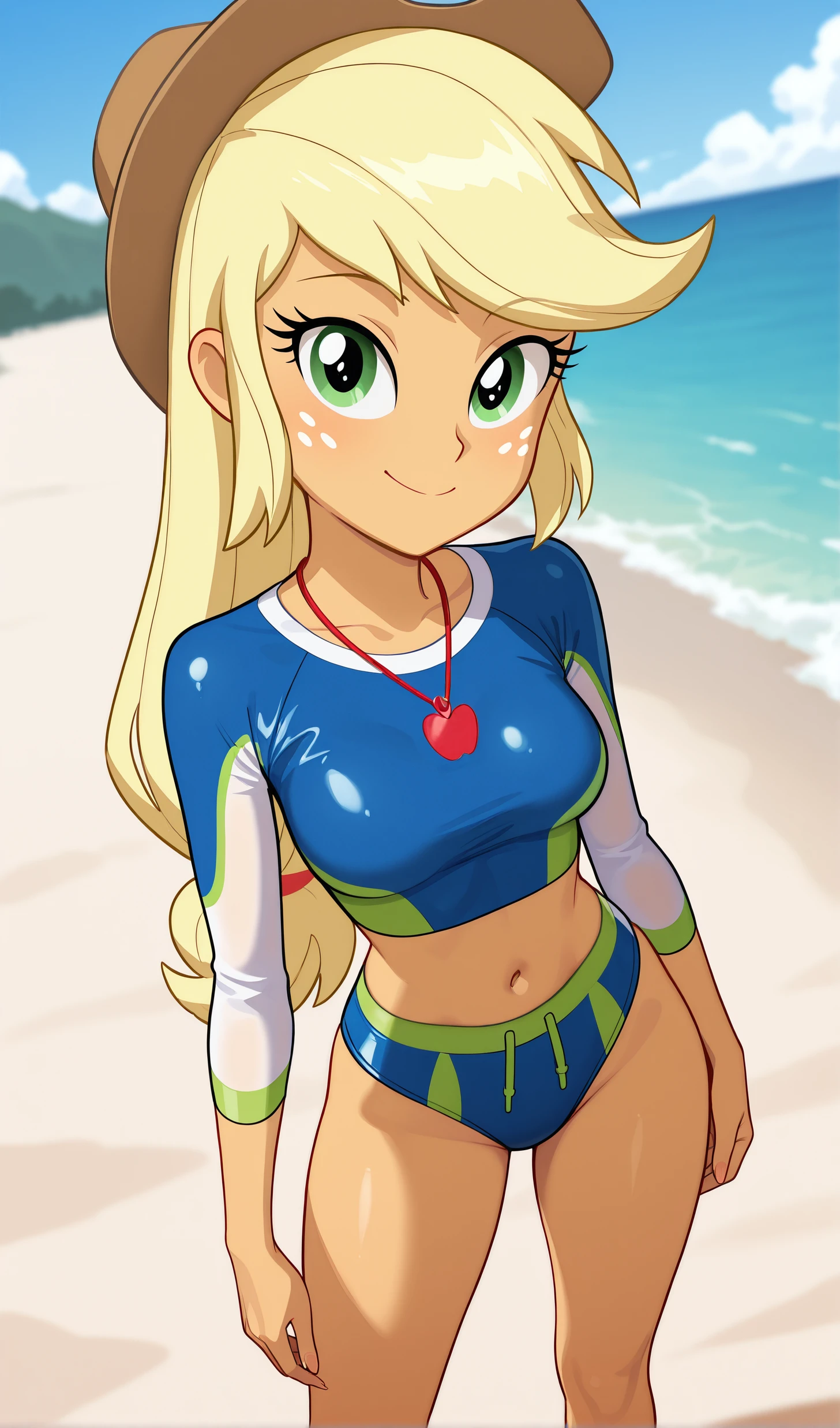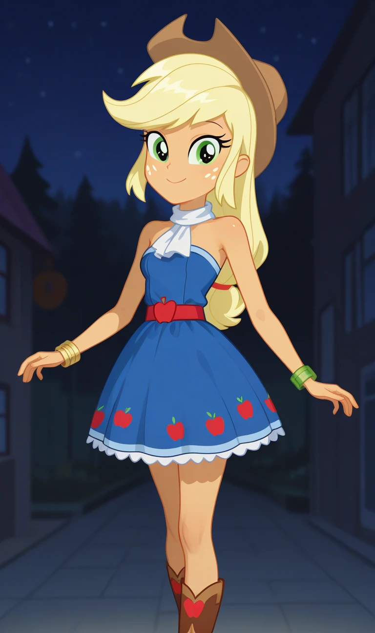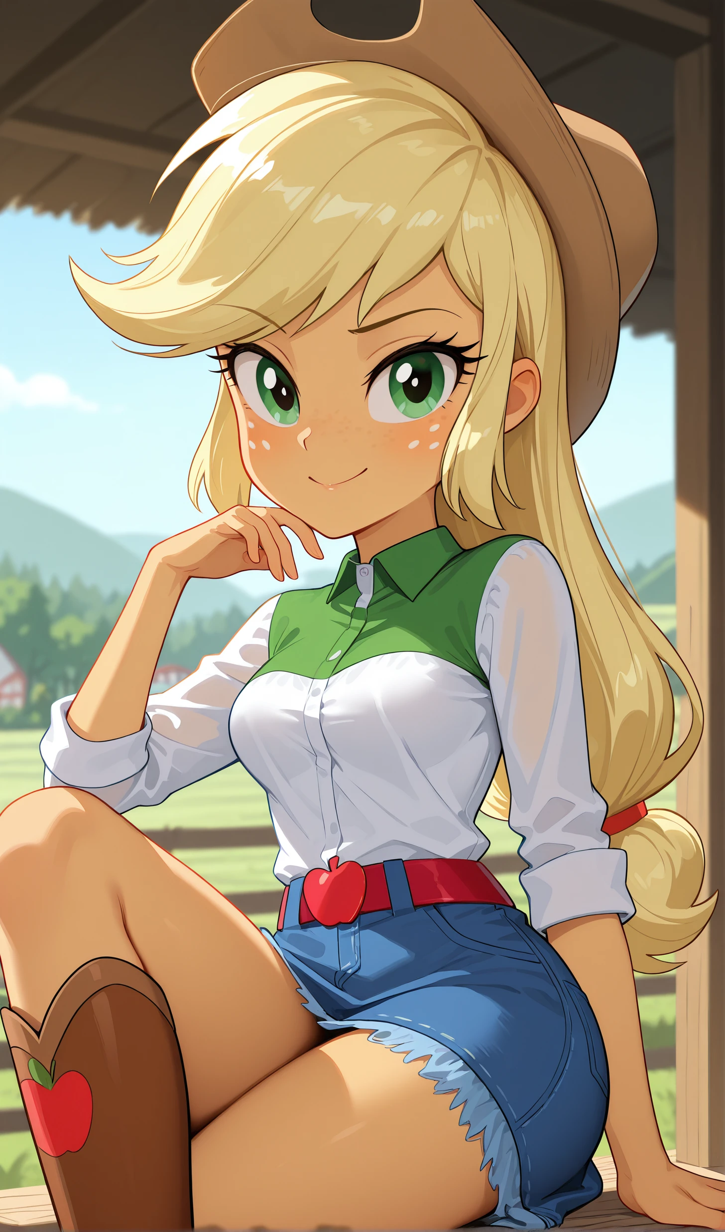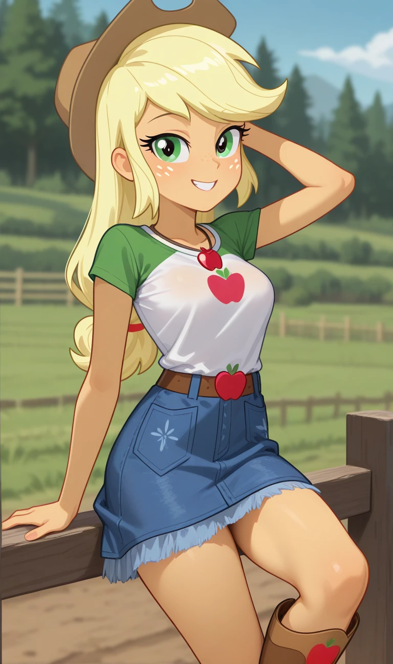 Applejack, Colored skin, Yellow skin, Long hair, Blonde hair, Green eyes, Freckles, White long-sleeved shirt, Cowboy hat, Hat, Skirt, Denim skirt, Belt, Brown boots