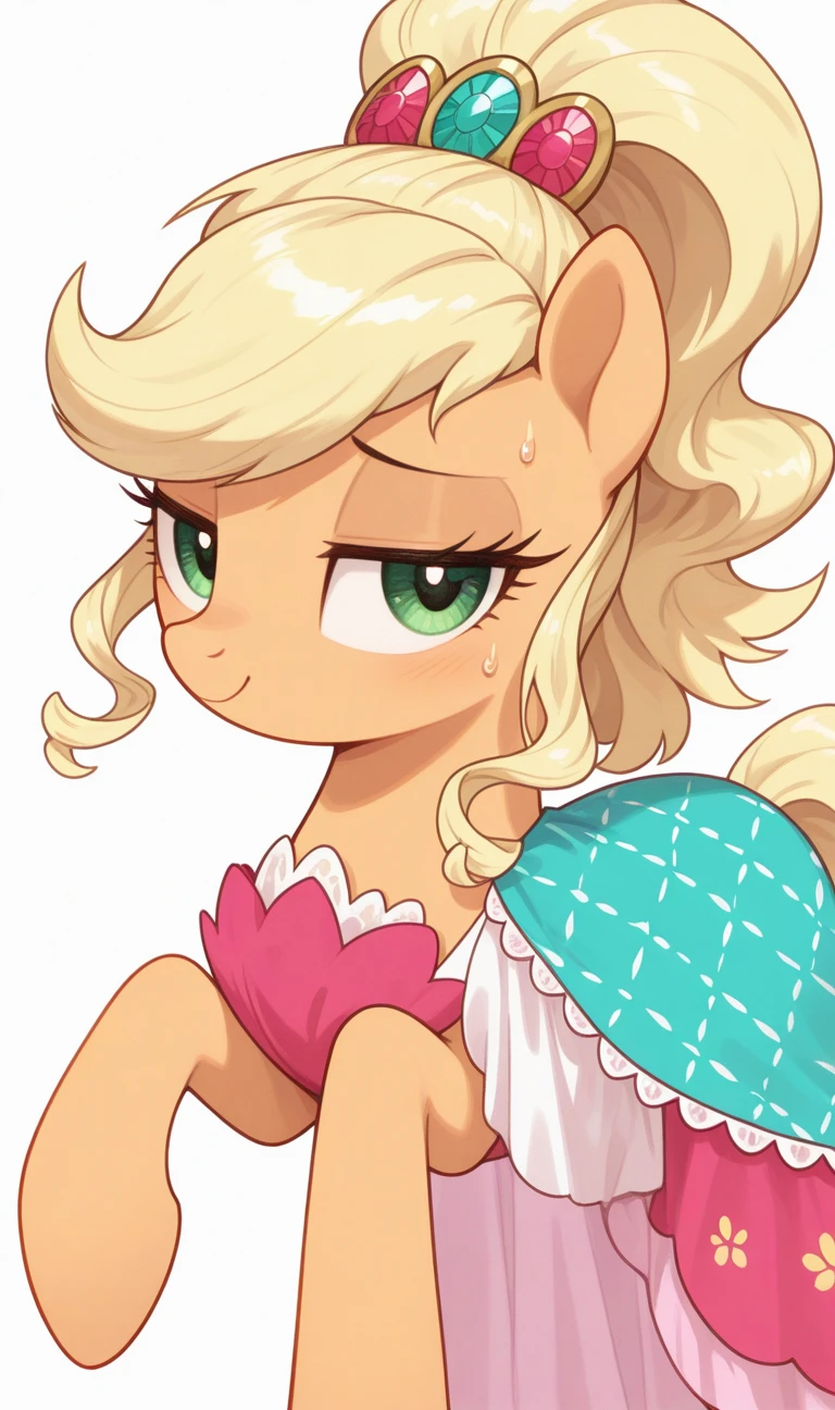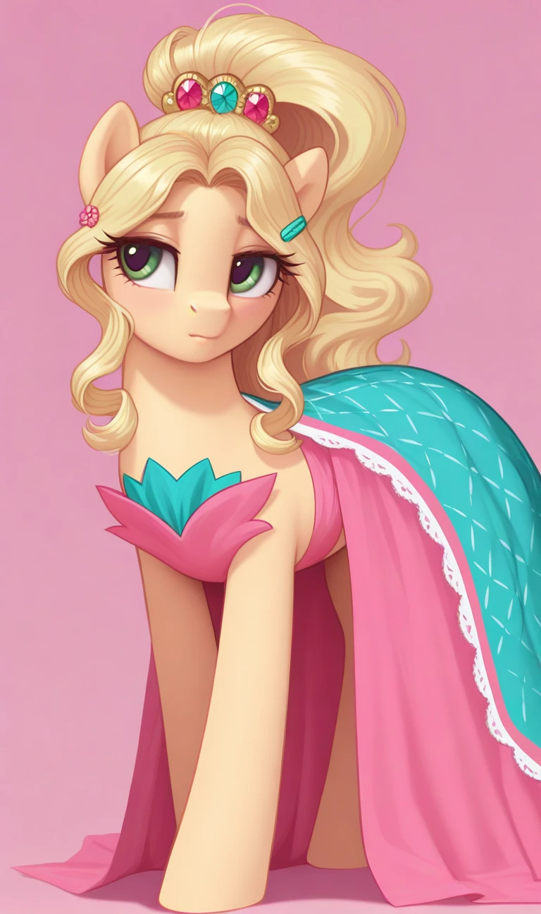 Applejewel, elegant look, high ponytail, wavy hair, gemstone hair clip, pink and turquoise gemstone hair clip, decorative hair accessory, pink dress, turquoise plaid cape, white cape with lace trim, floral shoulder design, pink floral design, flowing pink skirt, elegant cape, solo, green eyes, blonde hair,
