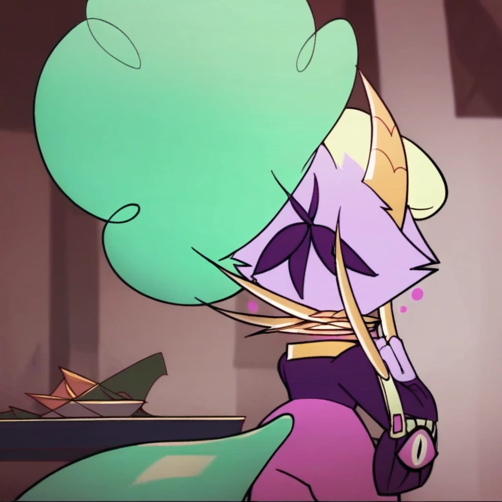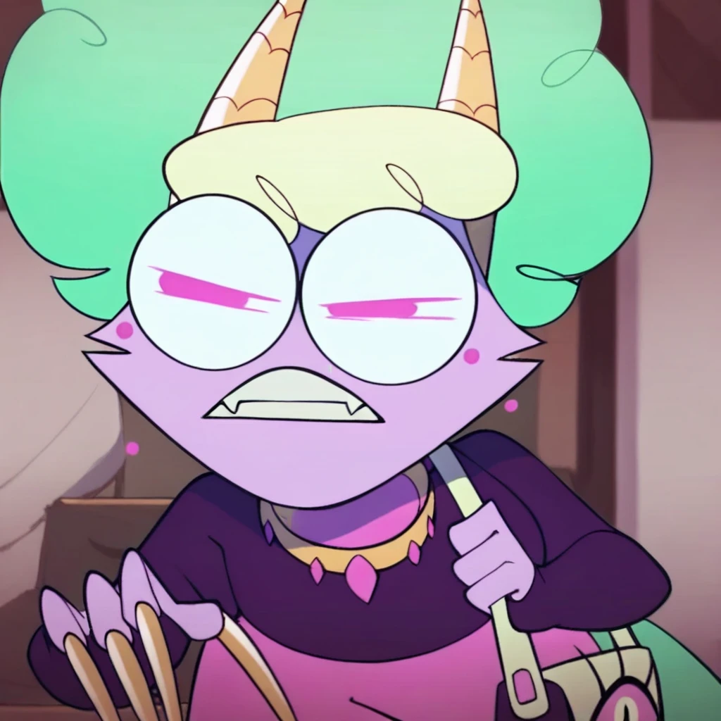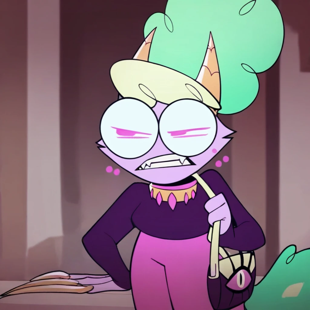 Rita, floating head, golden collar, purse, eye purse, pink fur, glasses, pink eyes, hair bun, multicolored hair, green hair, blonde hair, long nails, tail, purple shirt, pink pants